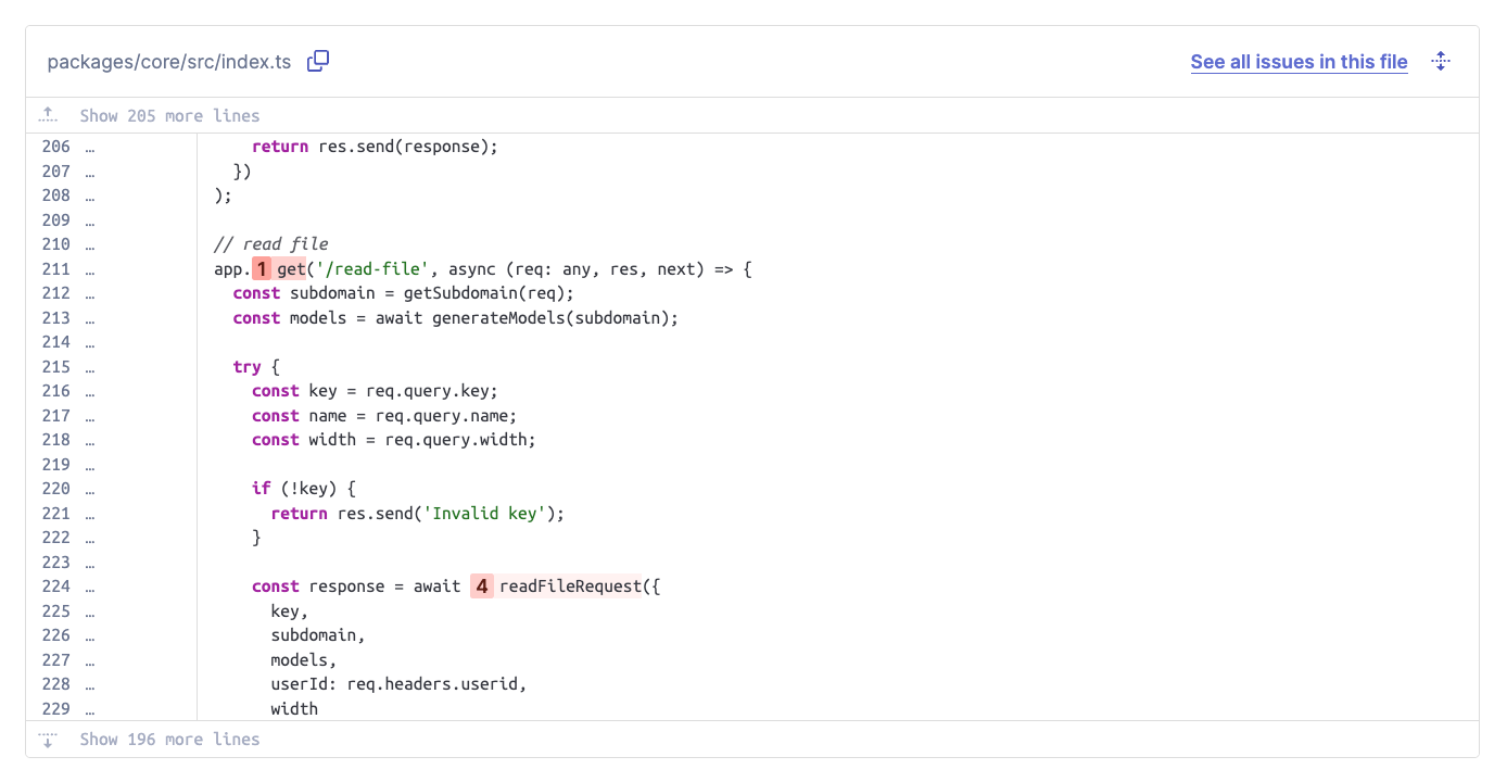 As we can see, the request handler for the /read-file endpoint takes several query parameters. One of them, named key, is then passed into the readFileRequest() function without prior validation. The missing validation allows attackers to send a request such as GET /read-file?key=../../../../some/secret/file to leak secrets of the application. This vulnerability is now tracked as CVE-2024-57186.