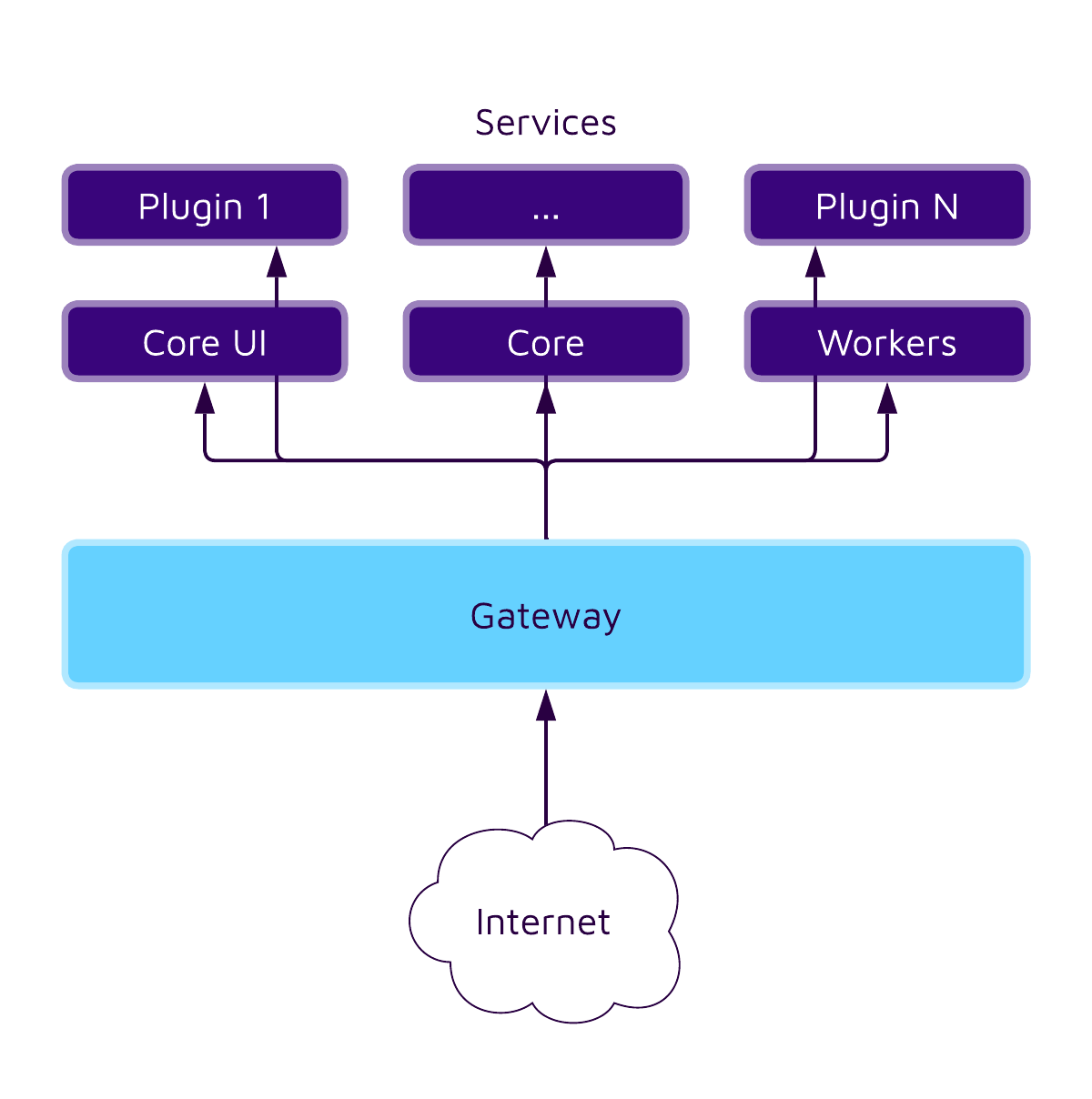 As we can see, Erxes consists of a central gateway and several microservices. There are also databases such as Redis that every service and the gateway can talk to, and services can speak to each other. Each part (gateway, services, databases) runs inside its own Docker container in production deployment.