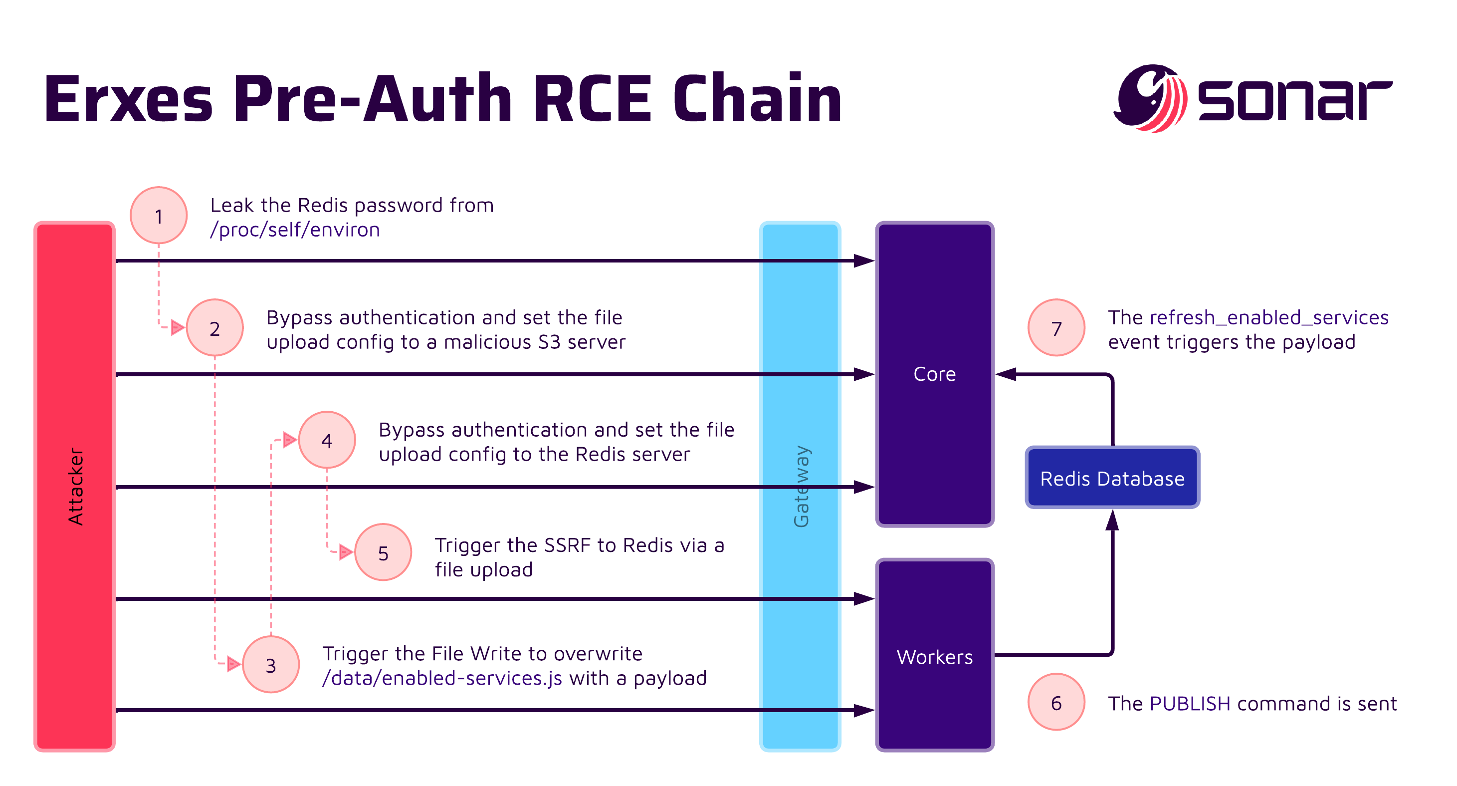 /data/enabled-services.jswith a malicious payload using the file write vulnerability. - Configure the S3 file storage to point to the Redis host and port using the authentication bypass vulnerability.