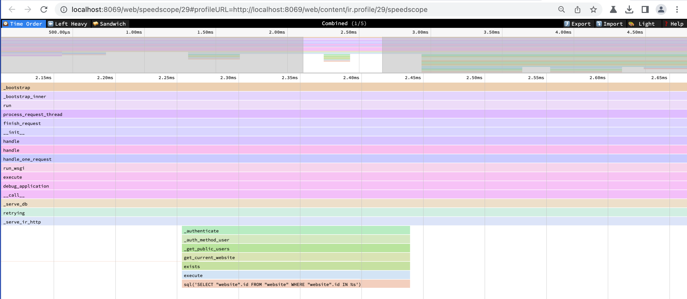 As part of the advanced features for developers, Odoo users can enable profiling for their session to identify potential performance bottlenecks in their application. They can later visualize flame graphs of their traces with a speedscope instance: