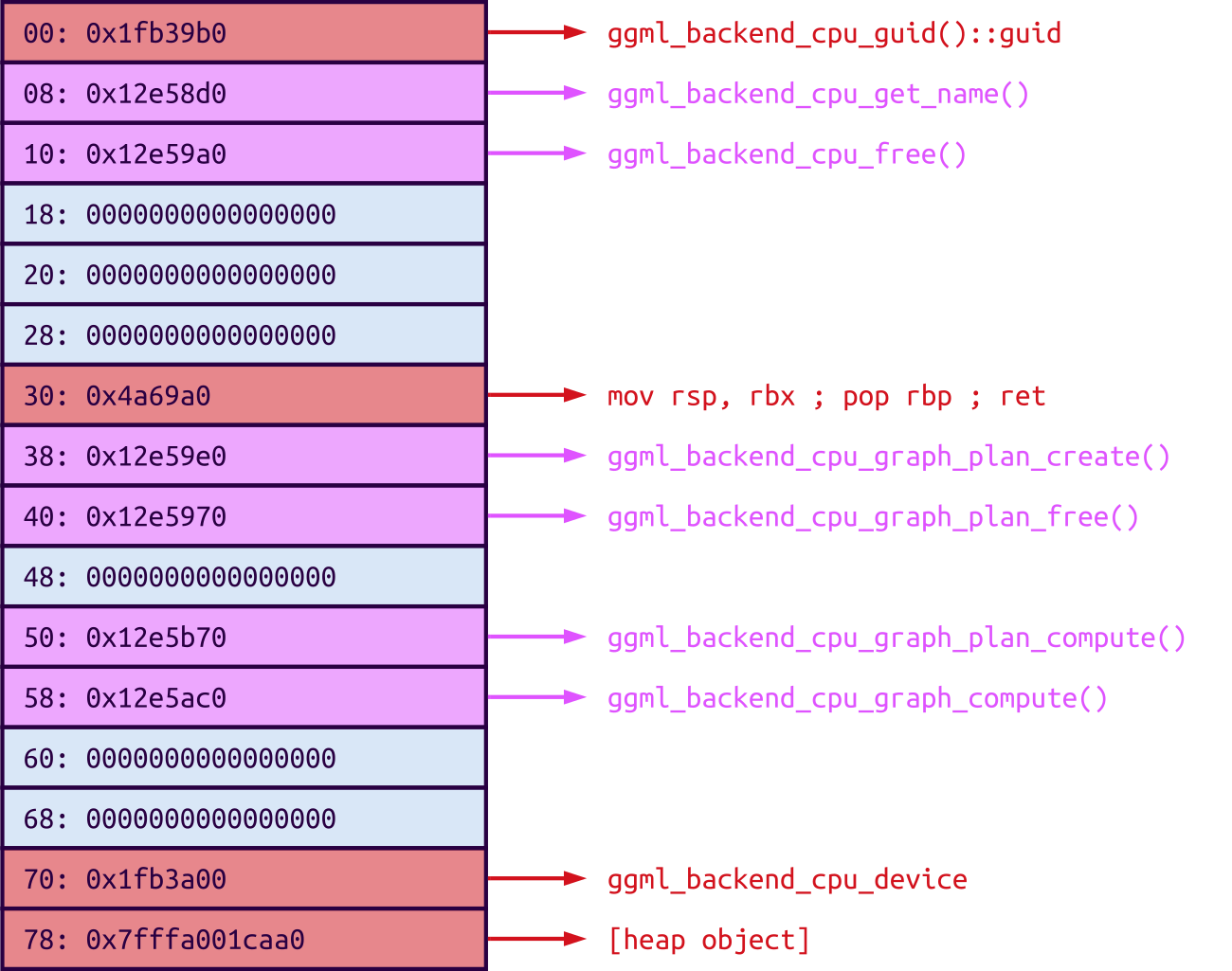 We chose to look for the latter first, and indeed, there were some structs in reach of the OOB write that are promising for an attacker. One of them, the ggml_backend struct, contains a bunch of function pointers, some of which are NULL: