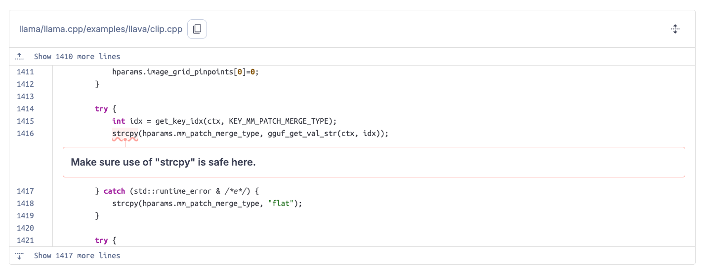 When approaching a target, we first scan it with SonarQube and triage the detected code issues. In the case of Ollama, SonarQube raised a usage of the dangerous strcpy() function:
