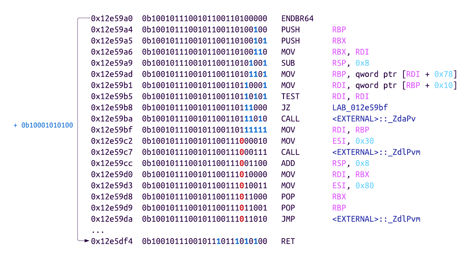 For example, the .free member points to the ggml_backend_cpu_free function at the address 0x12e59a0. Listing all valid code addresses that can be constructed from this address by flipping 0-bits, we can find some gadgets: