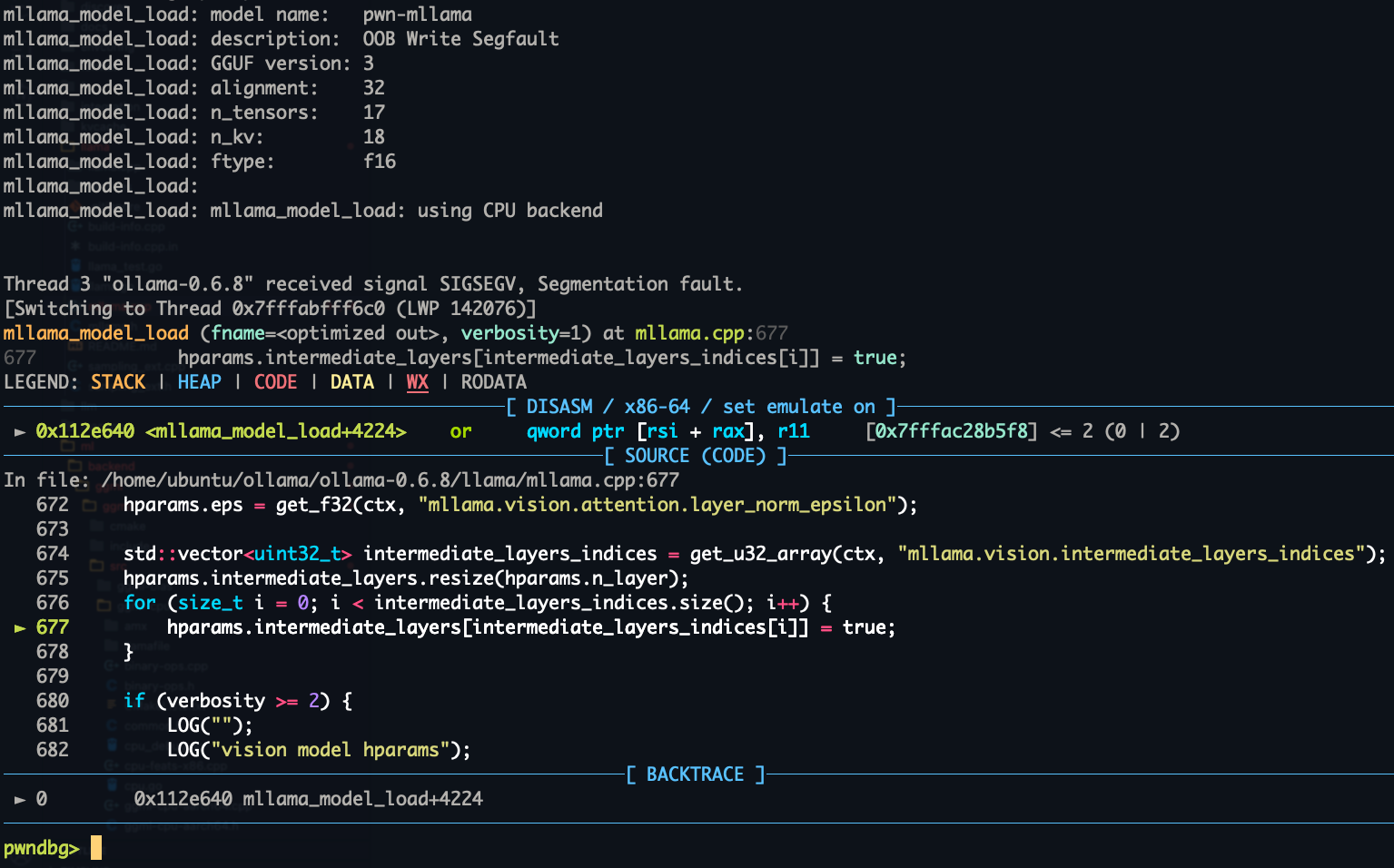 After some time, we finally managed to create a model that is only a few kilobytes big and can be processed by Ollama. We were able to confirm the controlled call by writing 0x4141414141414141 to the .synchronize member of the ggml_backend struct: