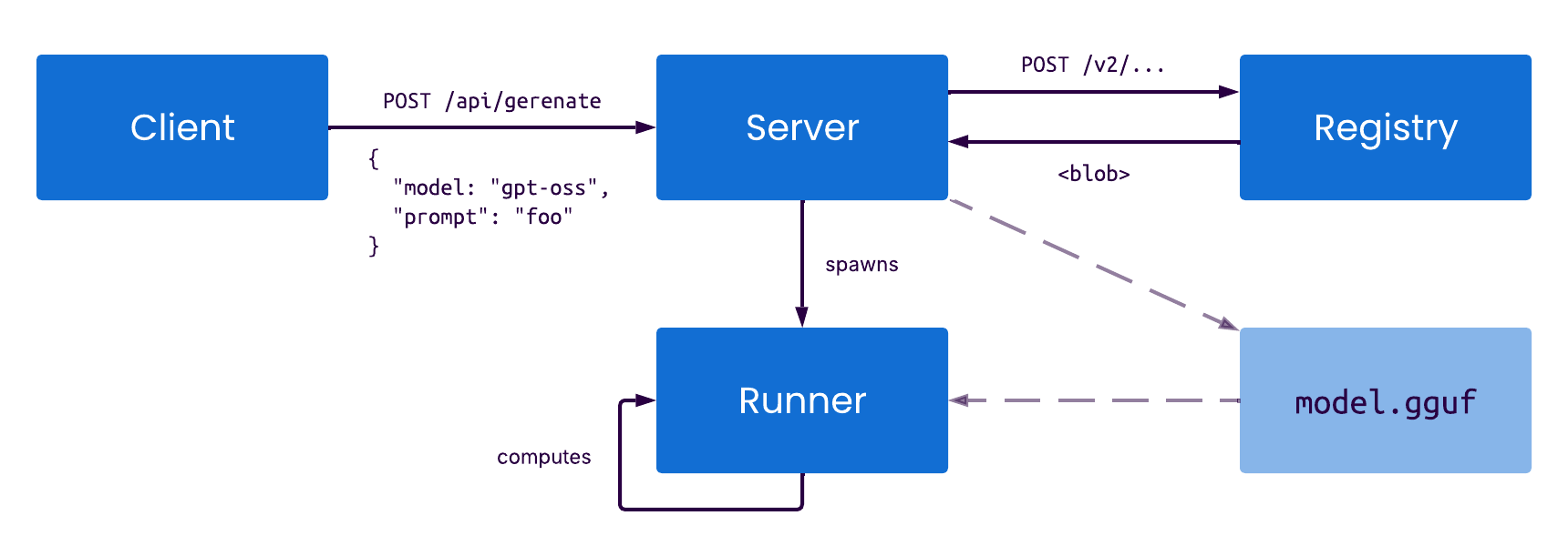 Ollama is mainly written in Go but uses C and C++ under the hood, for example to interface with the llama.cpp library. Especially compute-heavy tasks like inference are performed by C/C++ code. On a higher level, Ollama implements a client-server architecture, where the server can run locally or in the cloud, and the client is only used to interact with the server, e.g., to submit a prompt. The server then spawns a runner process per model to perform the inference and sends the result back to the client: