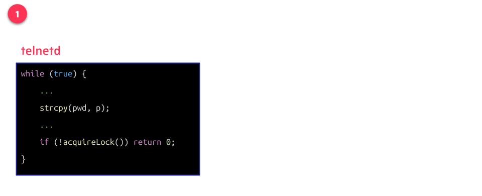The telnet service is implemented in /bin/telnetd. The binary accepts connections on port tcp/23, forks a new process, and binds stdin/stdout to the socket connection. In order to authenticate connecting users, the function cmsCli_authenticate, implemented in the library libcms_cli.so, reads the username and password in an infinite loop. The password is read via getpass, which dynamically allocates a buffer and is not limited by size on glibc. The password is later copied to a 256-byte stack buffer using strcpy. This results in a classical stack-overflow (code snippets shortened for better readability):