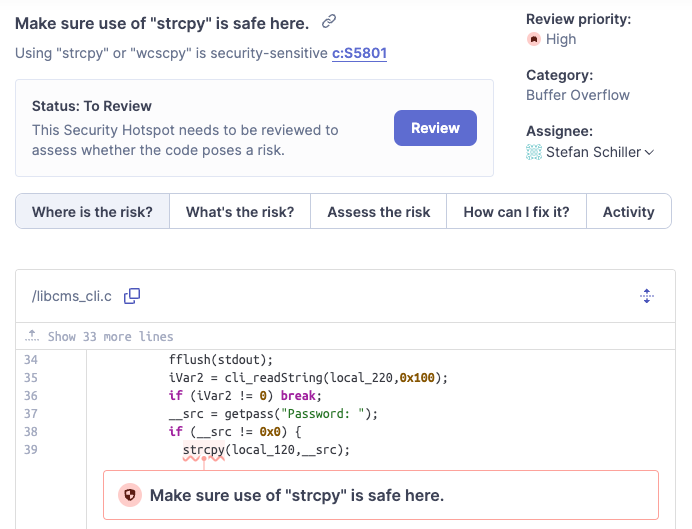 strcpy(pwd, p); This is one of the many vulnerability types SonarQube Cloud detects automatically. With the new Automatic Analysis feature for C&C++, it is not even required to manually set up your project. With just one click, you can feed the engine with the decompiled C source code and it will be analyzed without any setup pain (see it for yourself):
