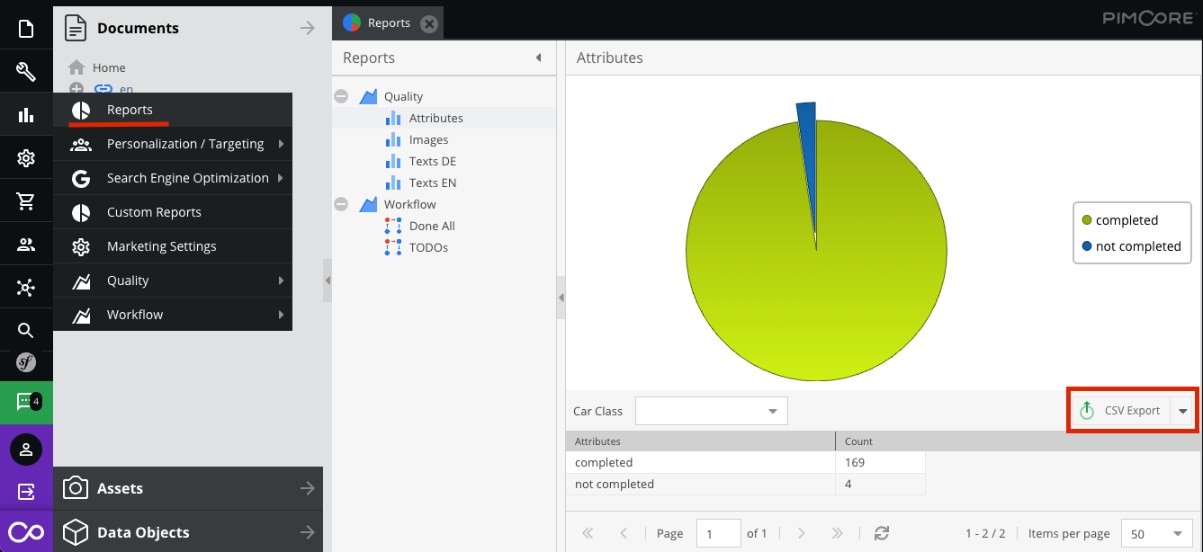 The underlined feature is in the admin panel of Pimcore which enables the display of statistical reports on various aspects of the website. An admin can create custom reports, view them directly from the panel, or download the data in CSV format: