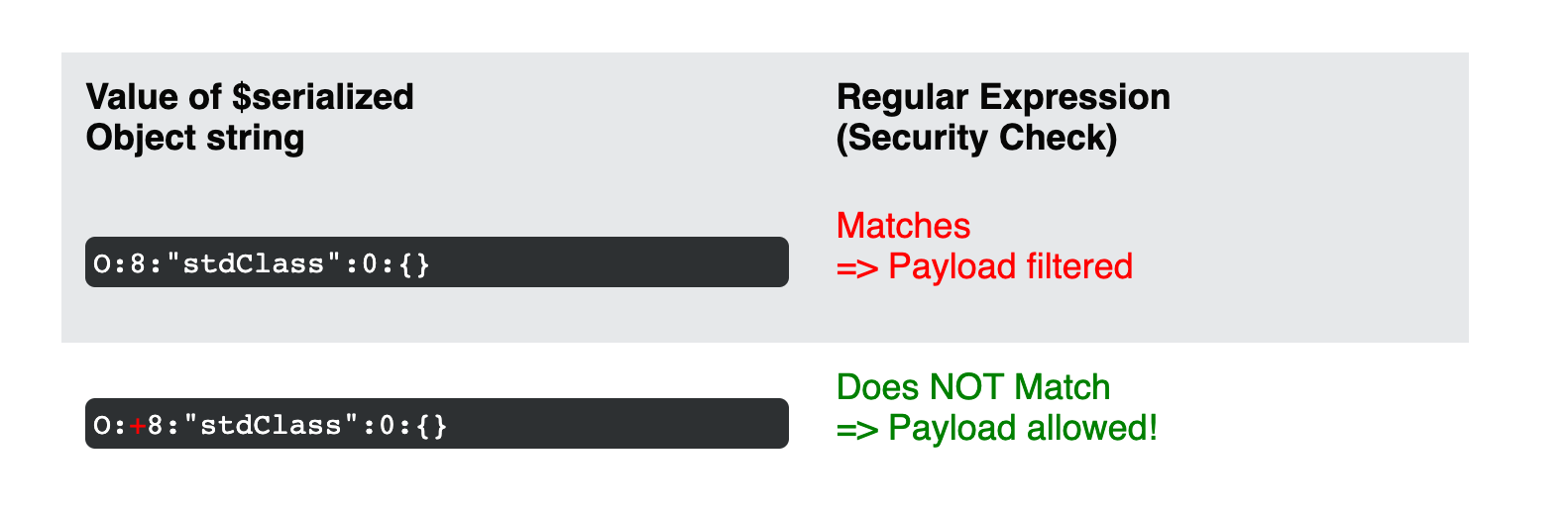 However, this black-list security approach is insufficient since not all serialized object strings match this regular expression. Similar to Challenge 11 of our PHP Advent Calendar 2017, it is possible to bypass the validation check and to inject any serialized object. This can be achieved by adding + characters to the length values of the serialized object string. These + characters will not break the unserialize() result but will bypass the matching pattern of the regular expression. The following table illustrates this effect: