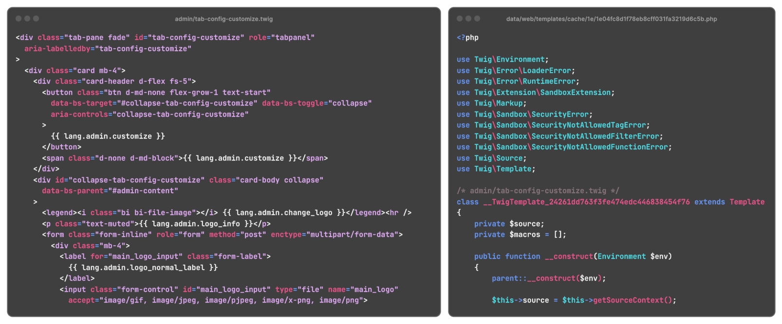 In the case of mailcow, there was one location left that could not be write-protected: the cache directory of mailcow's templating engine, Twig. Twig will compile a template to a PHP file when it is first used. After that, the PHP file is executed to render the template because it's much faster than interpreting the template every time it is used. This is how a template looks in its original form vs. its compiled form: