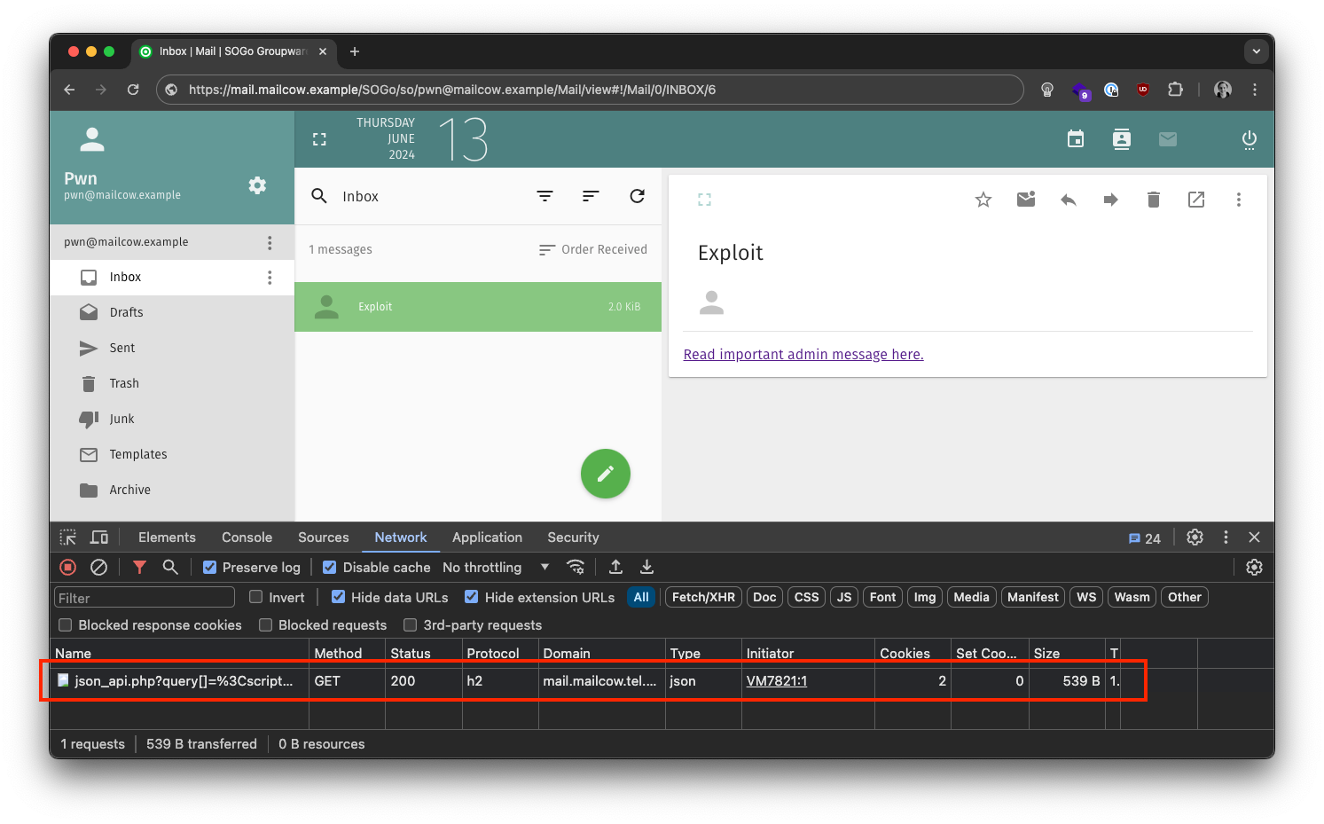 </style>Normally, mailcow and other email clients try to block resources loaded from remote sources by default. Since the background image URL is relative (it points to a resource on the same host), mailcow's webmail client, SOGo, does not prevent it from being loaded. This causes the browser to make the malicious request immediately upon opening the email: