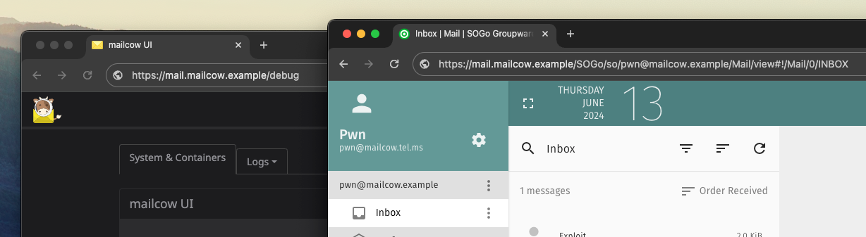 With all these tricks in their toolbelt, the attacker can now craft an email containing multiple stages of payloads that will eventually execute malicious OS commands on the admin panel's server. Luckily, all parts of mailcow run in separate Docker containers, so the attacker cannot easily escape and compromise the whole host system.