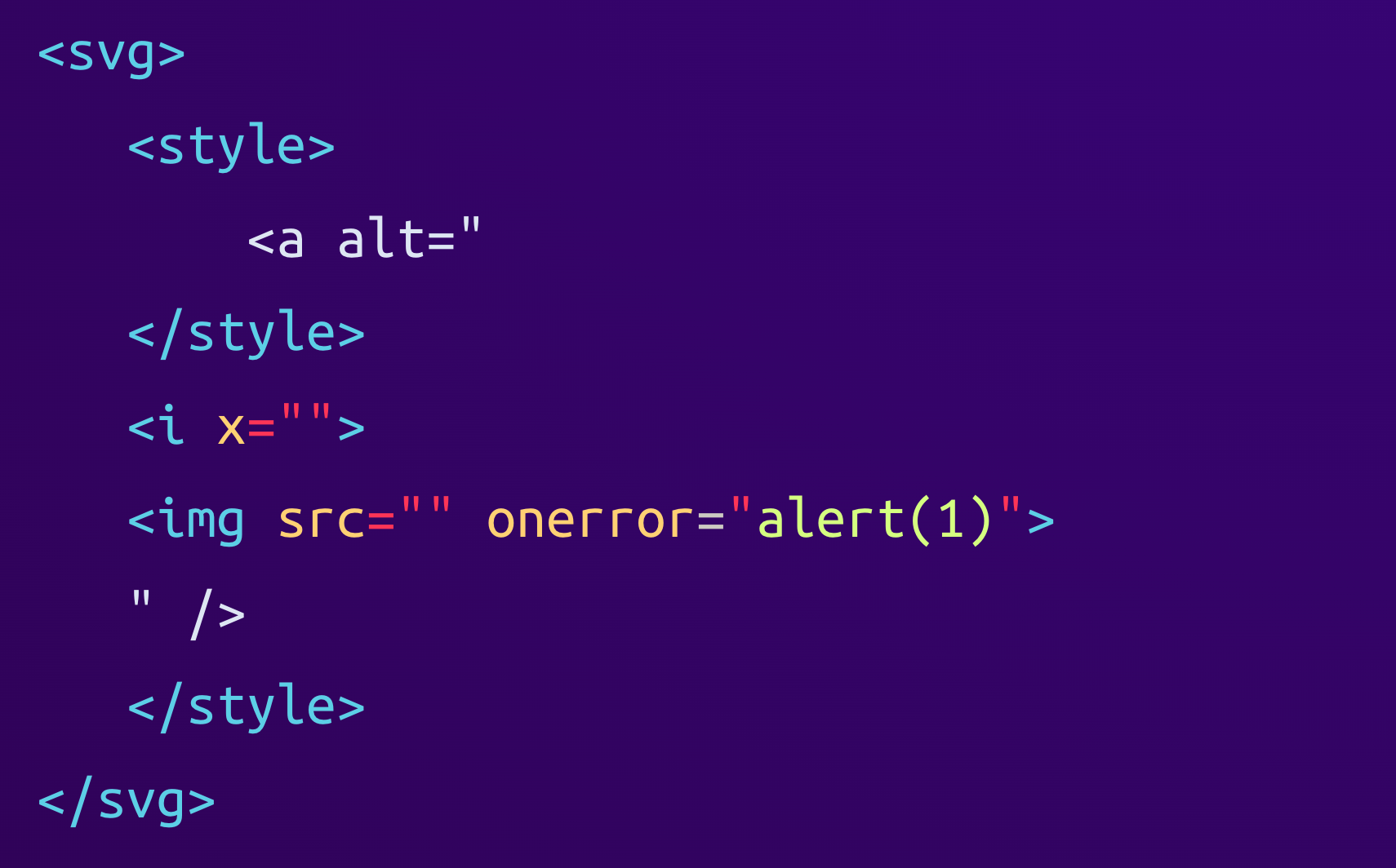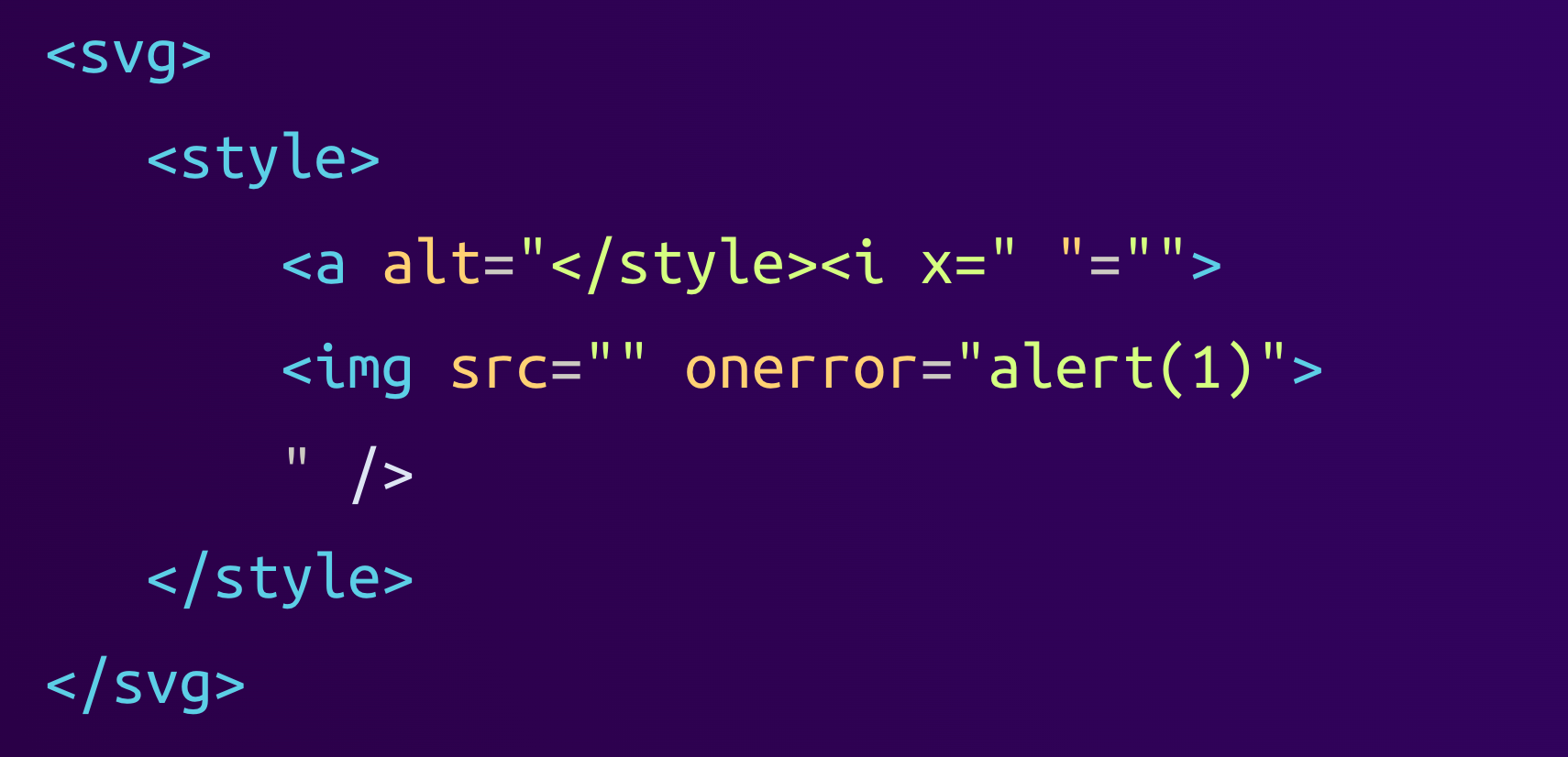 <svg><style><a alt="</style><i x=""><img src="" onerror="alert(1)">" /></style></svg>When the browser finally renders this HTML, it parses it as follows: