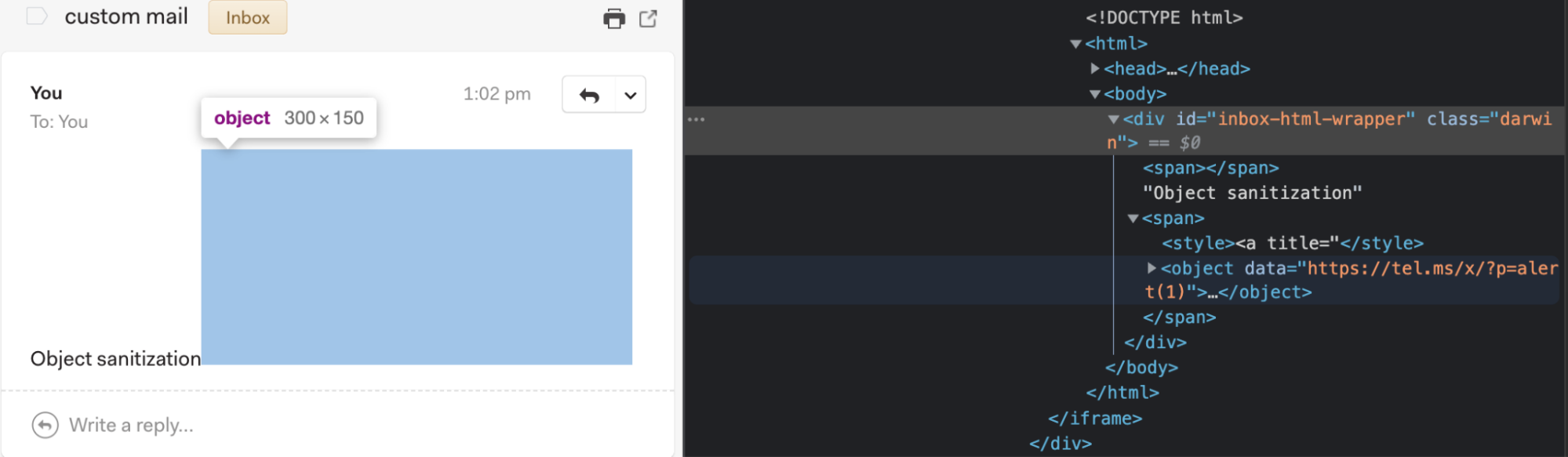 However, when sending a new payload that uses a malicious object tag to bypass the CSP, replying to/forwarding it, would mysteriously remove our tag. This did not happen for the initial payload with the img tag, so what is going on here?