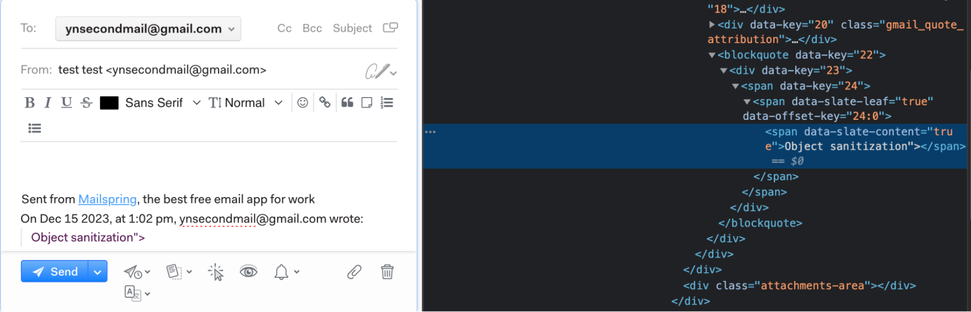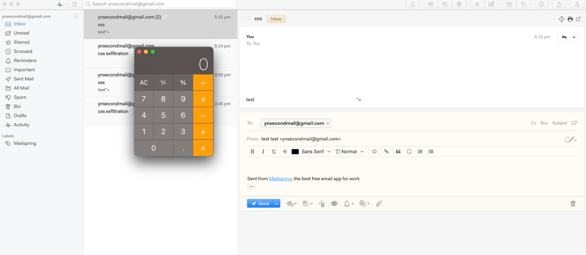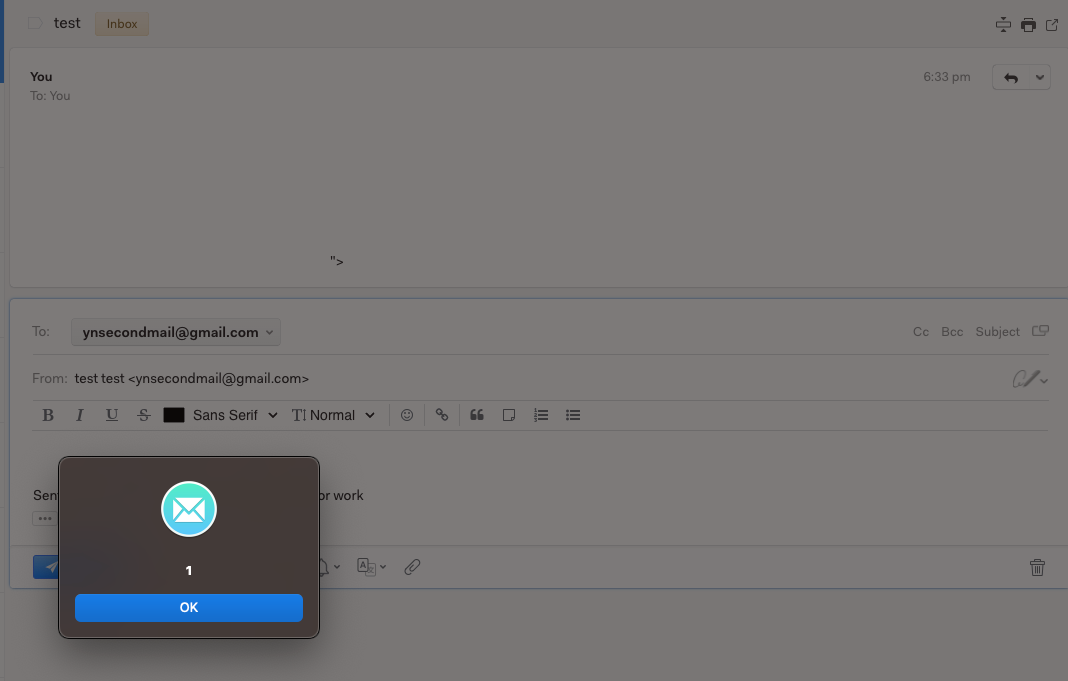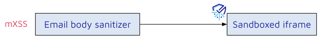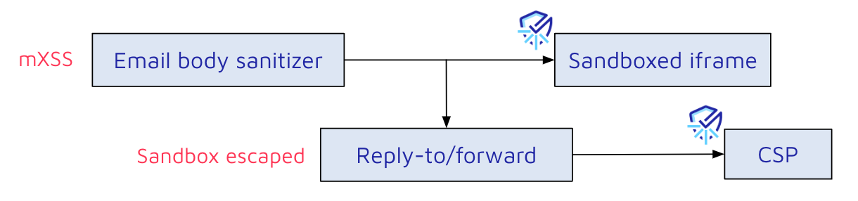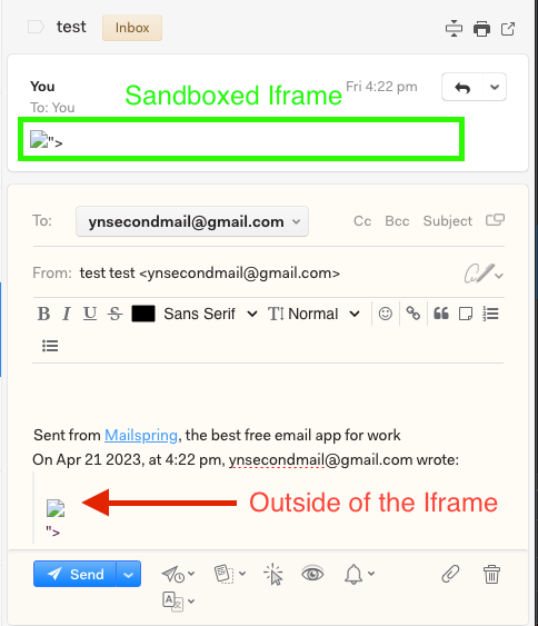 There is not much an attacker can do inside a sandboxed iframe, but we noticed that when a user replies to or forwards an email, the content of it will be rendered again outside of the sandboxed iframe.