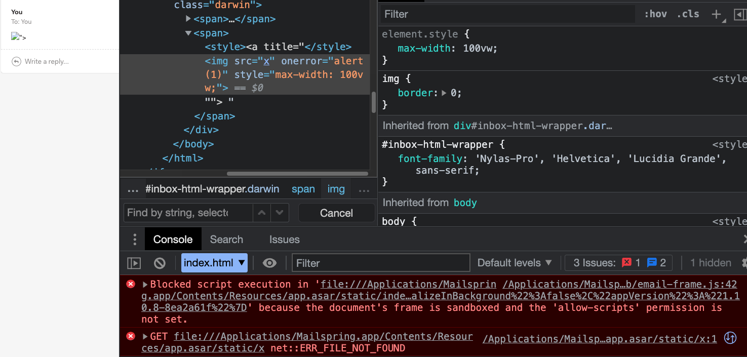 But sending an inline image (with CID) will cause the path to be reflected in the DOM. Using that, an attacker can use known CSS exfiltration techniques, given that CSS is allowed by Mailspring’s sanitizer, to extract the random path of the controlled file. Then use the same XSS as before but point the object’s data tag to the controlled file. Since it's the same origin as the main window, accessing parent and running arbitrary node commands is possible.