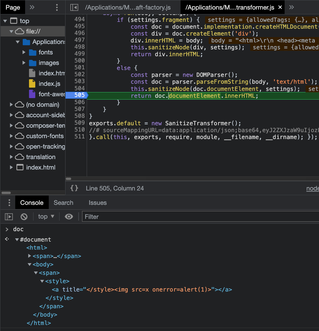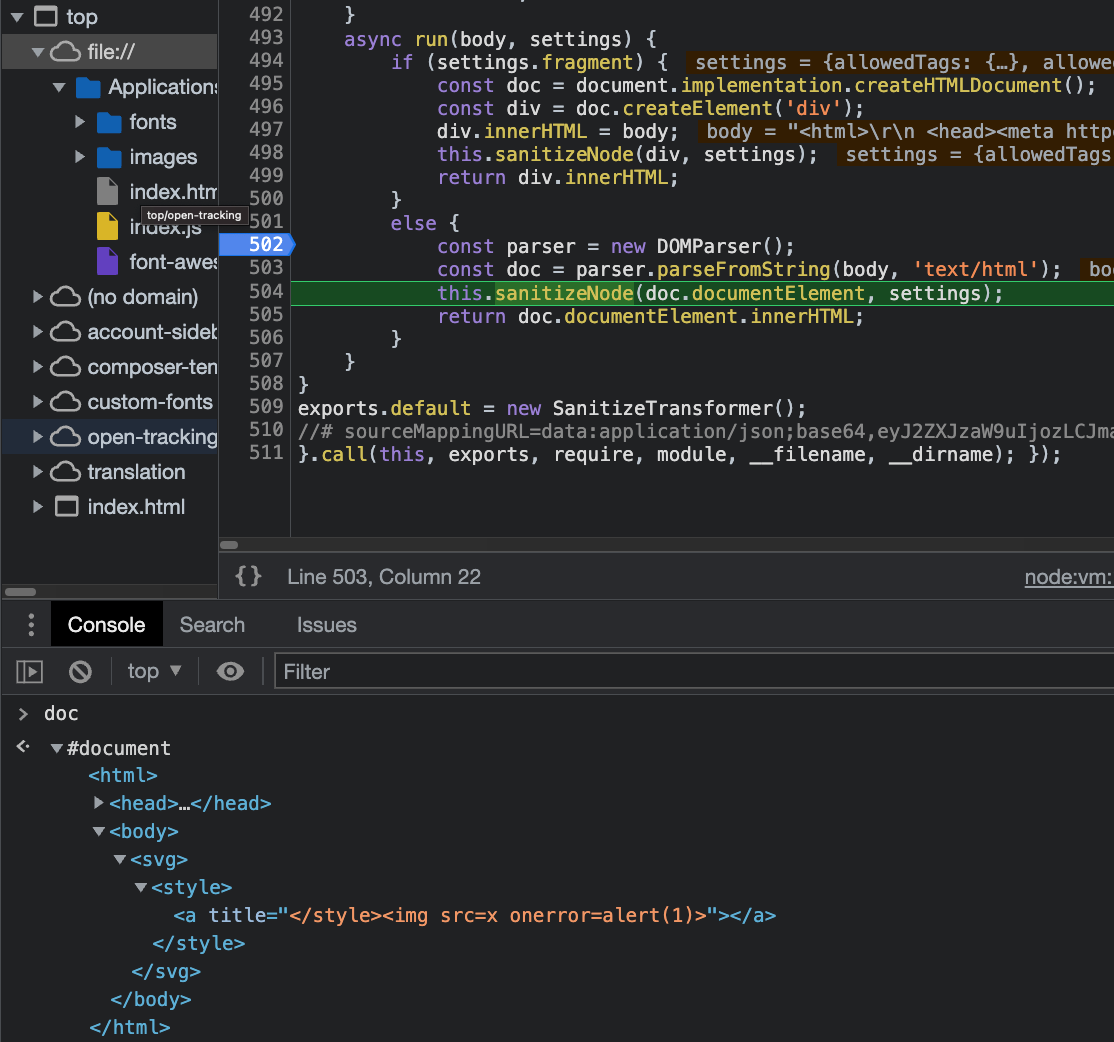 Mailspring doesn’t allow svg tags and will replace them with span tags during the sanitization. We covered the risk of “Desanitization” (the act of changing and interfering with the sanitizer’s output) in previous blogs where we encountered other vulnerabilities that follow this dangerous behavior: