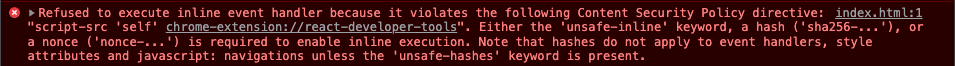 However, the injected JavaScript code will still not run because of a Content Security Policy in the main window: