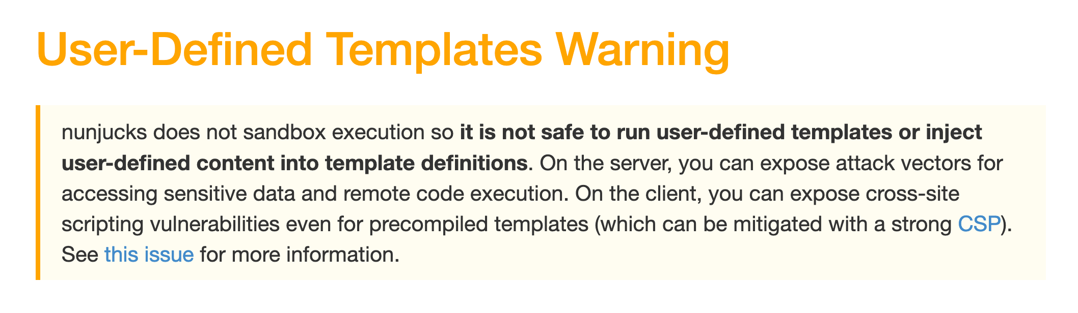 While templating does not necessarily allow for arbitrary code execution, Nunjucks explicitly warns about this risk in their documentation: