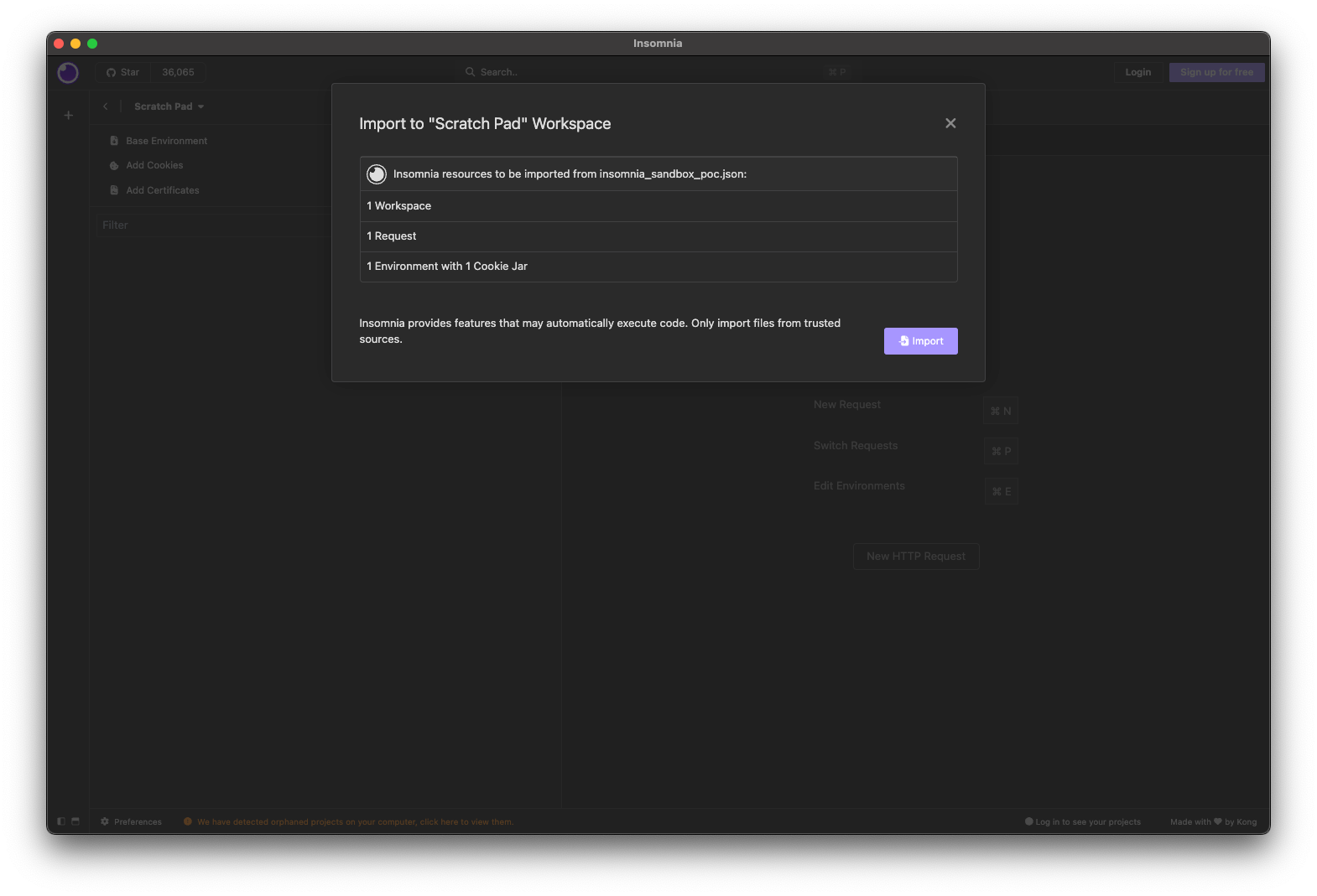 To fix the issue with pre-request scripts, Insomnia removed access to the fs module, preventing malicious scripts from accessing the file system. In addition to that, Insomnia added a small disclaimer to the import window, warning the user about importing files from untrusted sources: