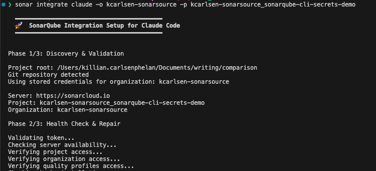 sonar integrate claude -o <YOUR_ORG_KEY> -p <YOUR_PROJECT_KEY>Note: Server users will use the -s flag.