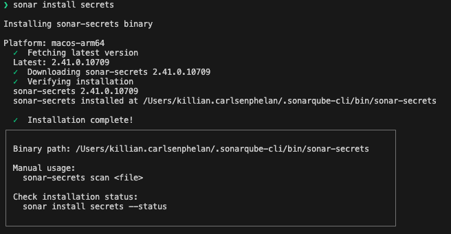 sonar install secretsThe sonar-secrets binary handles the actual pattern matching. It covers 450+ distinct secret patterns across 248 cloud services, using both format-specific rules and entropy-based detection for unknown secret types.