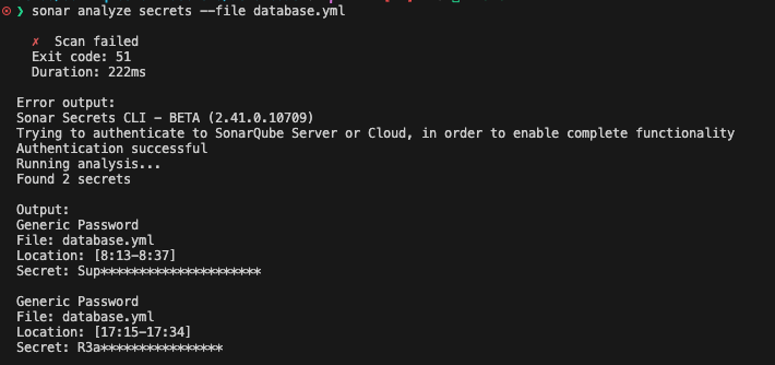 The "Scan failed" message looks alarming, but it's working exactly as intended. In fact, it found 2 secrets. Exit code 51 means "secrets detected." A non-zero exit code is what makes this scanner useful as a gate. CI pipelines, pre-commit hooks, and agent integrations all rely on exit codes to decide whether to proceed or block. Exit code 0 means clean; exit code 51 means stop.