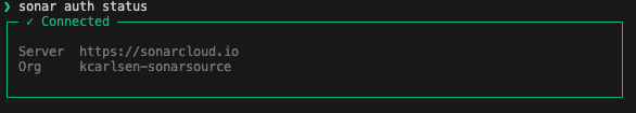 sonar auth login -o <YOUR_ORG_KEY> -t <YOUR_TOKEN>If you prefer, sonar auth login without flags opens a browser-based flow where SonarQube Cloud generates a token for you. For SonarQube Server, use sonar auth login -s https://your-server-url --with-token <TOKEN> instead. The CLI will then prompt for your organization key.