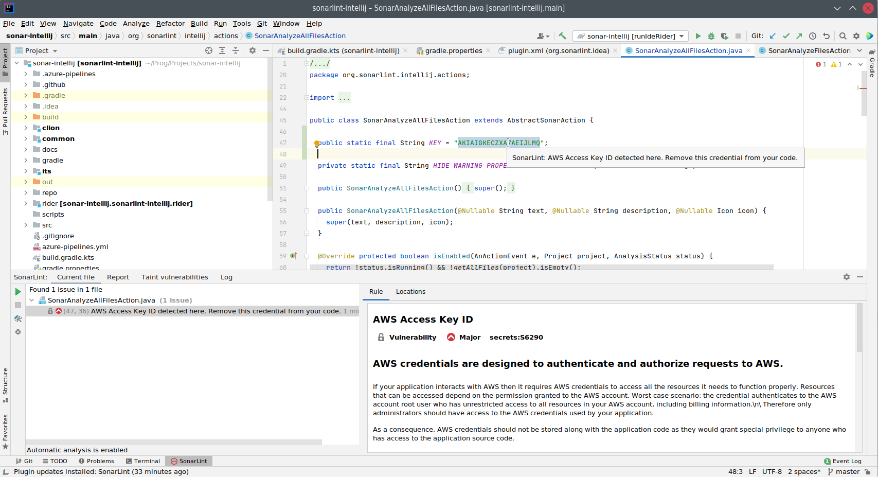 SonarQube for IDE can help identify these situations while you’re coding, whether they’re application-specific secrets, or access keys for authorizing the application to a third party. Take the following screenshot for example, in which AWS access keys and secrets could have been inadvertently committed and propagated to many other systems. Detecting these while you’re coding is an invaluable tool to protect against future security concerns.