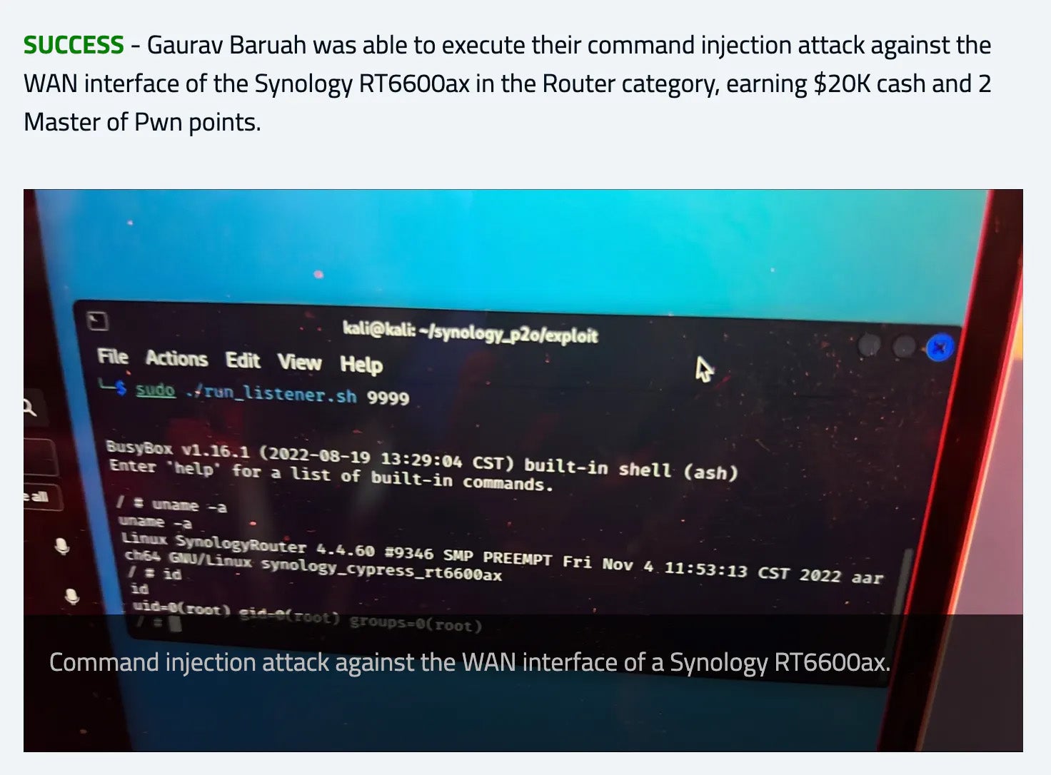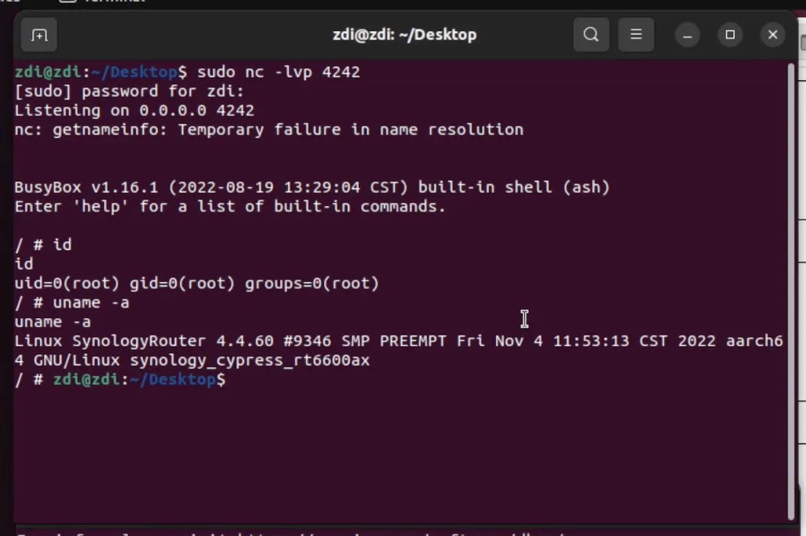 We demonstrated our vulnerability on December 9 at 20:30 and we successfully took control of the Synology RT6600ax on the WAN interface!