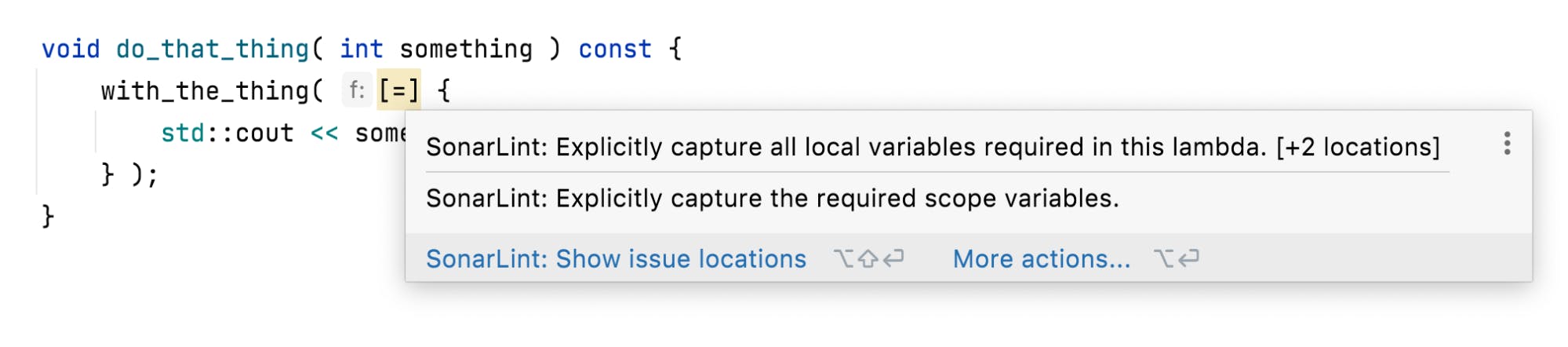 Of course SonarQube for IDE has many rules that are not, currently at least, implemented at all by clang-tidy or CLion. For example, S3608 suggests that “Default capture should not be used”. This corresponds to Item #31 of Scott Meyers’ “Effective Modern C++”, and is partially captured (if you’ll excuse the pun) by the Core Guidelines and Google’s C++ Style Guide.