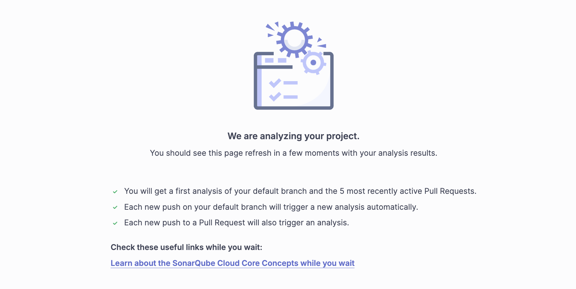After importing your projects, and if you use a GitHub repository, SonarQube Cloud will check your imported repository to see if it qualifies for automatic analysis. If it does, the analysis will start automatically and the results will be delivered to you, without the need to configure a CI-based analysis.
