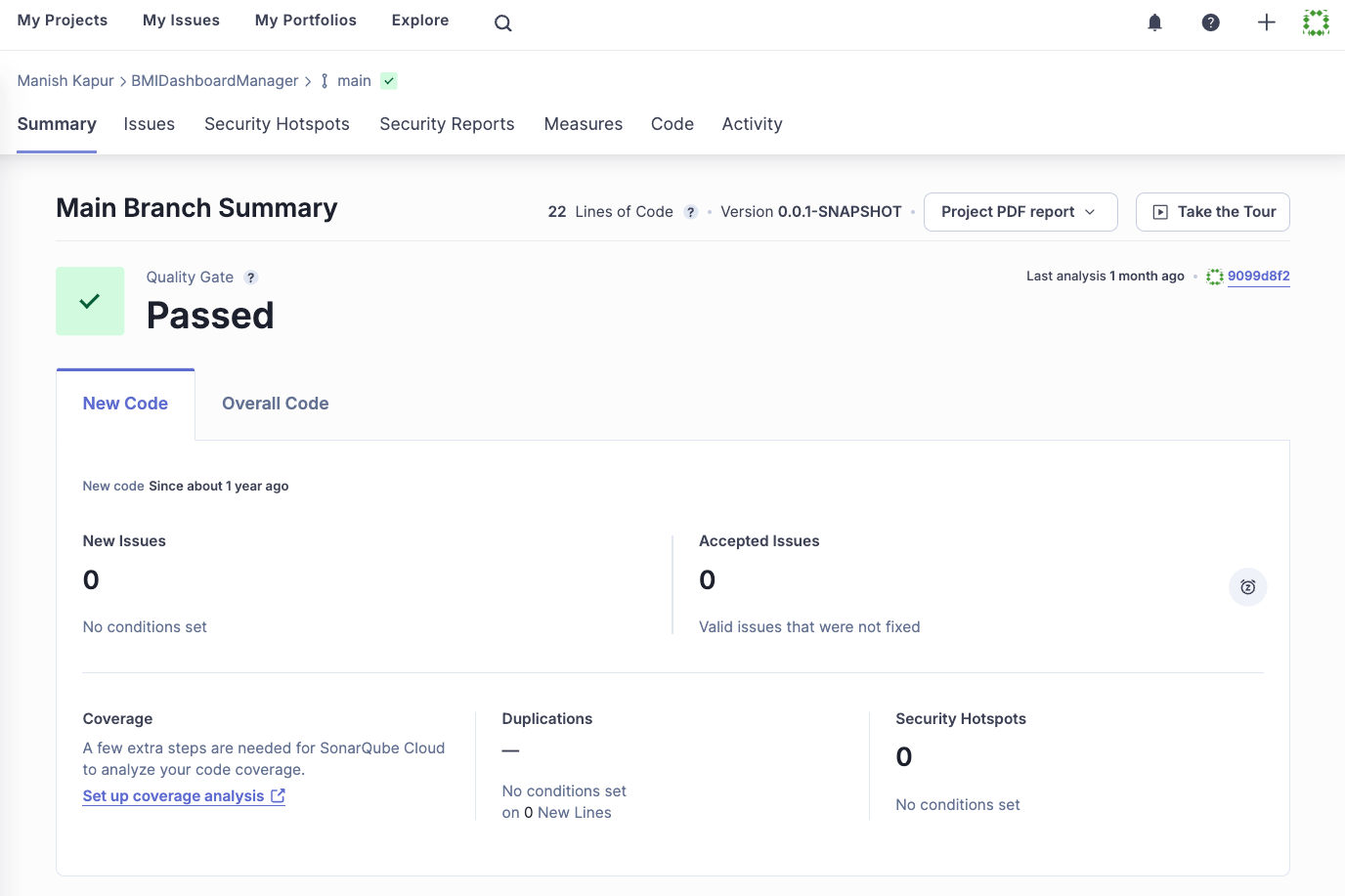 • Run Your First Analysis: Trigger your first analysis by pushing code to your main branch or creating a pull request. SonarQube Cloud will automatically analyze the code and provide feedback on any issues detected.