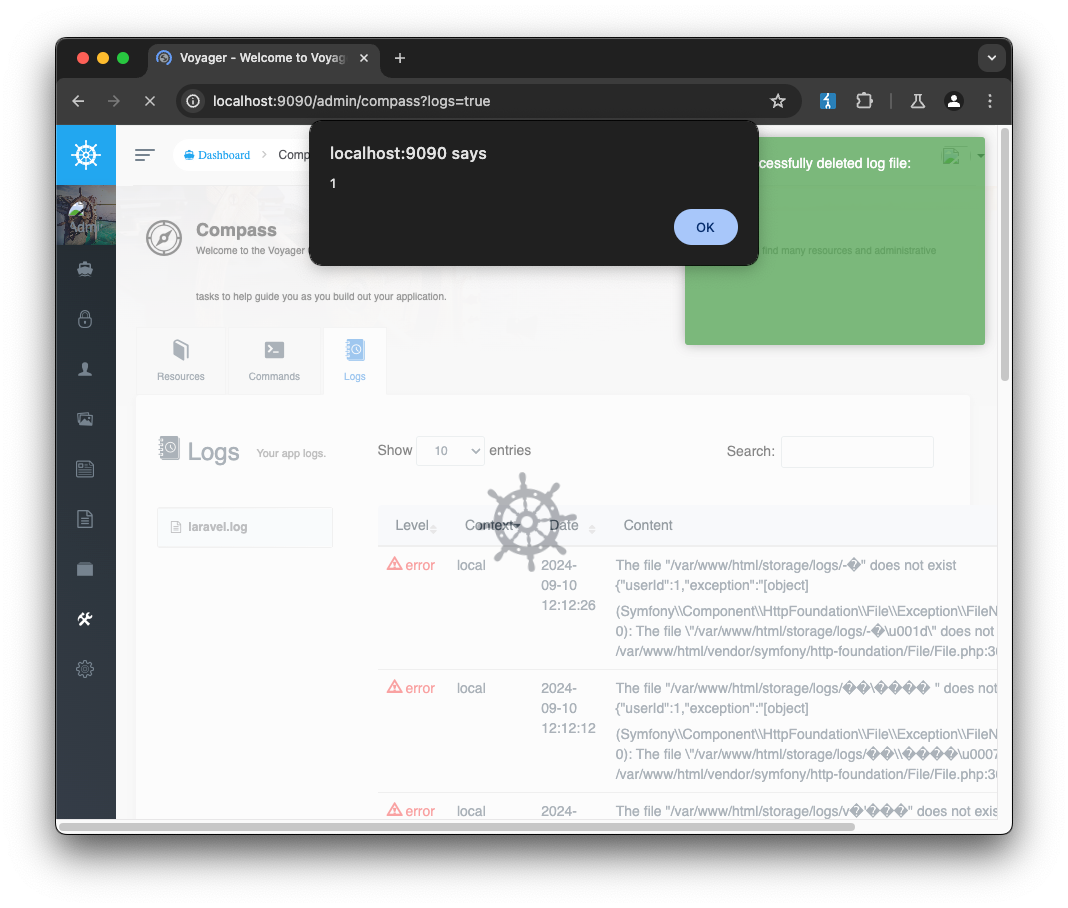 When auditing the rest of the Voyager codebase we noticed an interesting endpoint: the /admin/compass which gets handled by the VoyagerCompassController@index component, allowing the execution of certain actions via a GET request. Despite it still requiring admin permissions when handling GET requests, an attacker can craft a URL and manipulate an authenticated user to invoke the request by clicking on the link.
