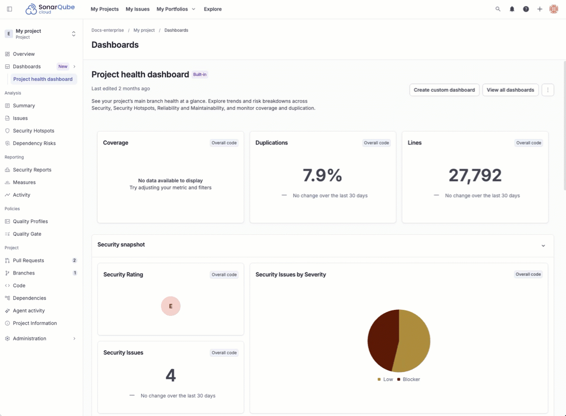 Every project now comes with a built-in project health dashboard. This provides an immediate, consolidated view of the essential indicators: Security, Reliability, Maintainability, and Coverage. It is designed to give you instant value, without requiring any configuration.