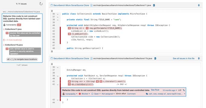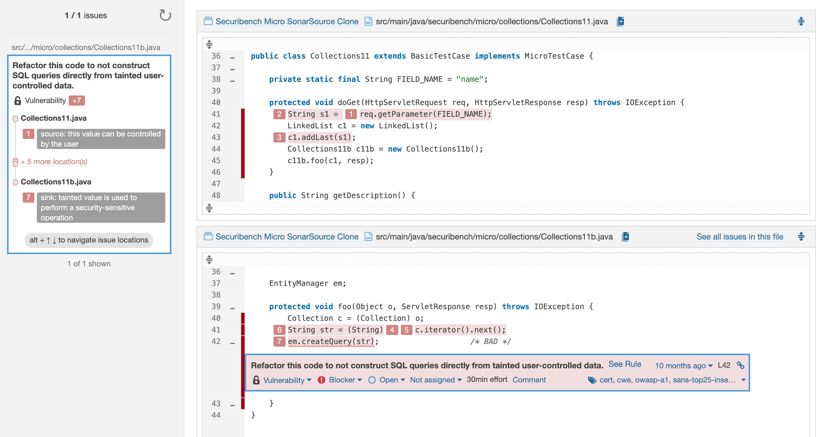 Here, in the 'doGet' method, user-supplied data is stored in a collection. Then in another method in a different file, it's retrieved from the collection and sent to the database. Again, without being sanitized. In the SonarQube Server UI this example is easy to understand because all the relevant files are shown together, with each propagation of the taint highlighted, but it would be much harder than the first example to find manually. Because if you start from the 'doGet' method, you have to find every place the method is called from and then follow the data it returns until it's no longer "live" to make sure it's not misused. On the other hand, you could start from the other end and go backward to the source of every value sent to this "sink" (place where the data is stored/used). That might be a little cleaner, but it's no less painful.