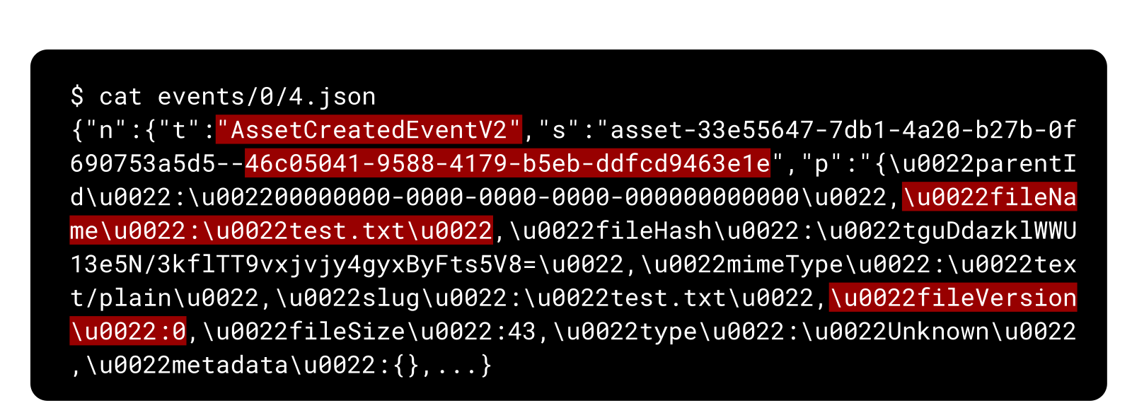 Amongst other things, the JSON file contains the event type (AssetCreatedEventV2), the ID of the asset (46c05041-9588-4179-b5eb-ddfcd9463e1e), its original filename (test.txt), and its file version (0):