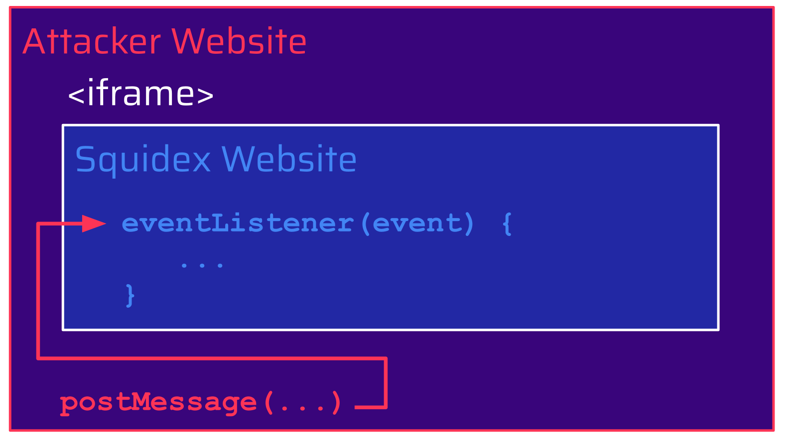 // ...Although the event listener checks the source of the event (event.source), it is indeed missing a check of its origin (event.origin). Because of this as well as the lack of X-Frame-Options and Content-Security-Policy, a malicious website can include the Squidex website in an iframe and use the postMessage method to trigger the execution of the event listener in the context of the included Squidex website:
