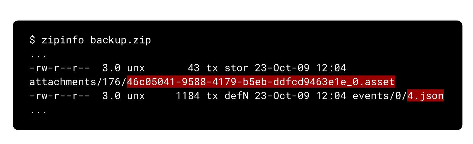 Squidex allows users with the squidex.admin.restore permission to create and restore backups. Part of these backups are uploaded assets. For each asset, the backup zip archive contains a .asset file with the actual content of the asset as well as a related AssetCreatedEventV2 event, which is stored in a JSON file (4.json):