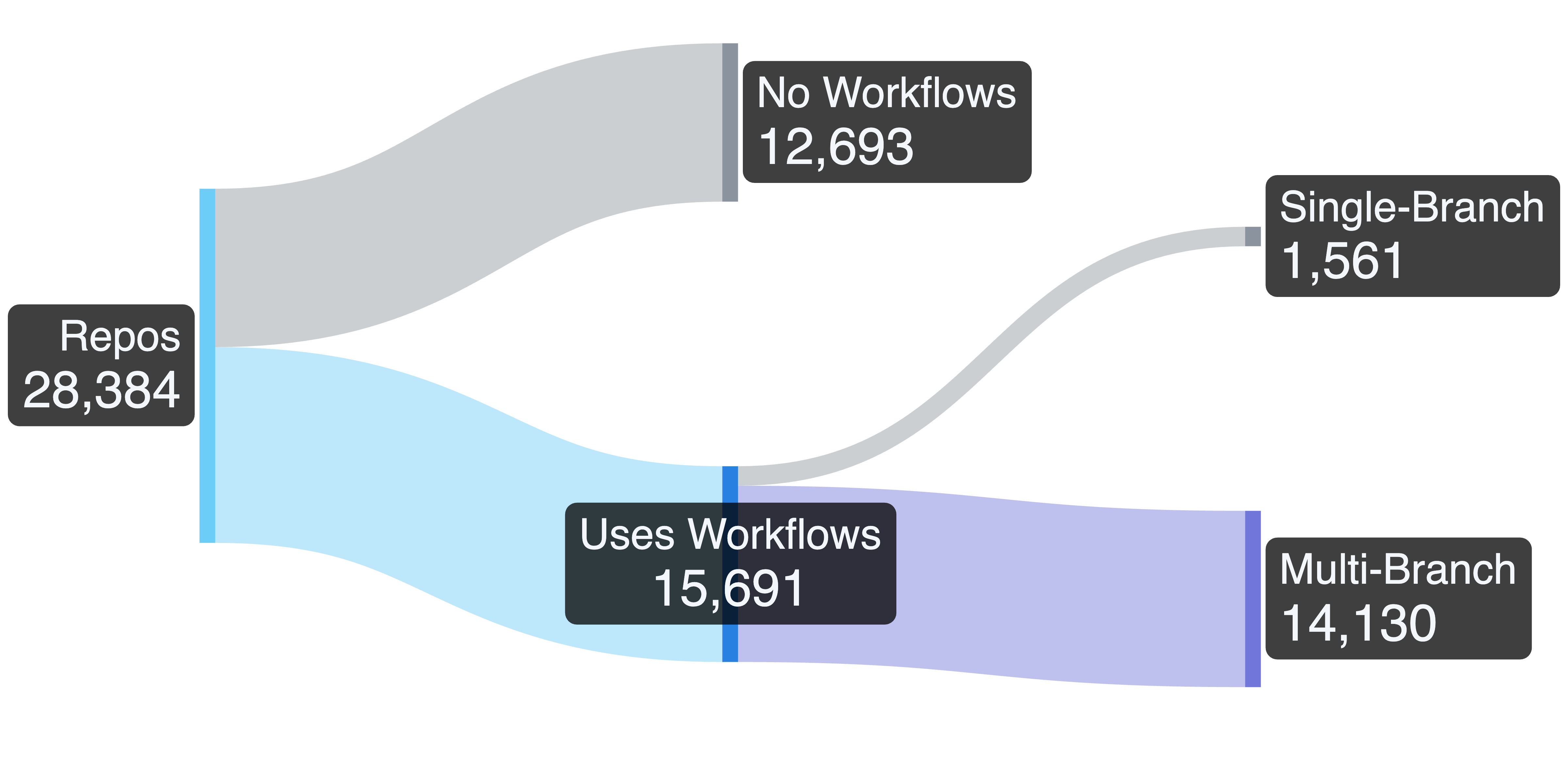 We started by crawling the workflows of top repositories with more than 2000 GitHub stars. This limit was arbitrarily as a rough proxy for the popularity of the repos. This left us with 28,384 repositories from which we filtered out repos not containing any workflows, leaving us with 15,691 repos that do use GitHub Actions. From these, we removed all repos that only have a single branch, because by definition, there couldn't be Zombie Workflows here. This left us with 14,130 repos that we needed to scan for workflow files: