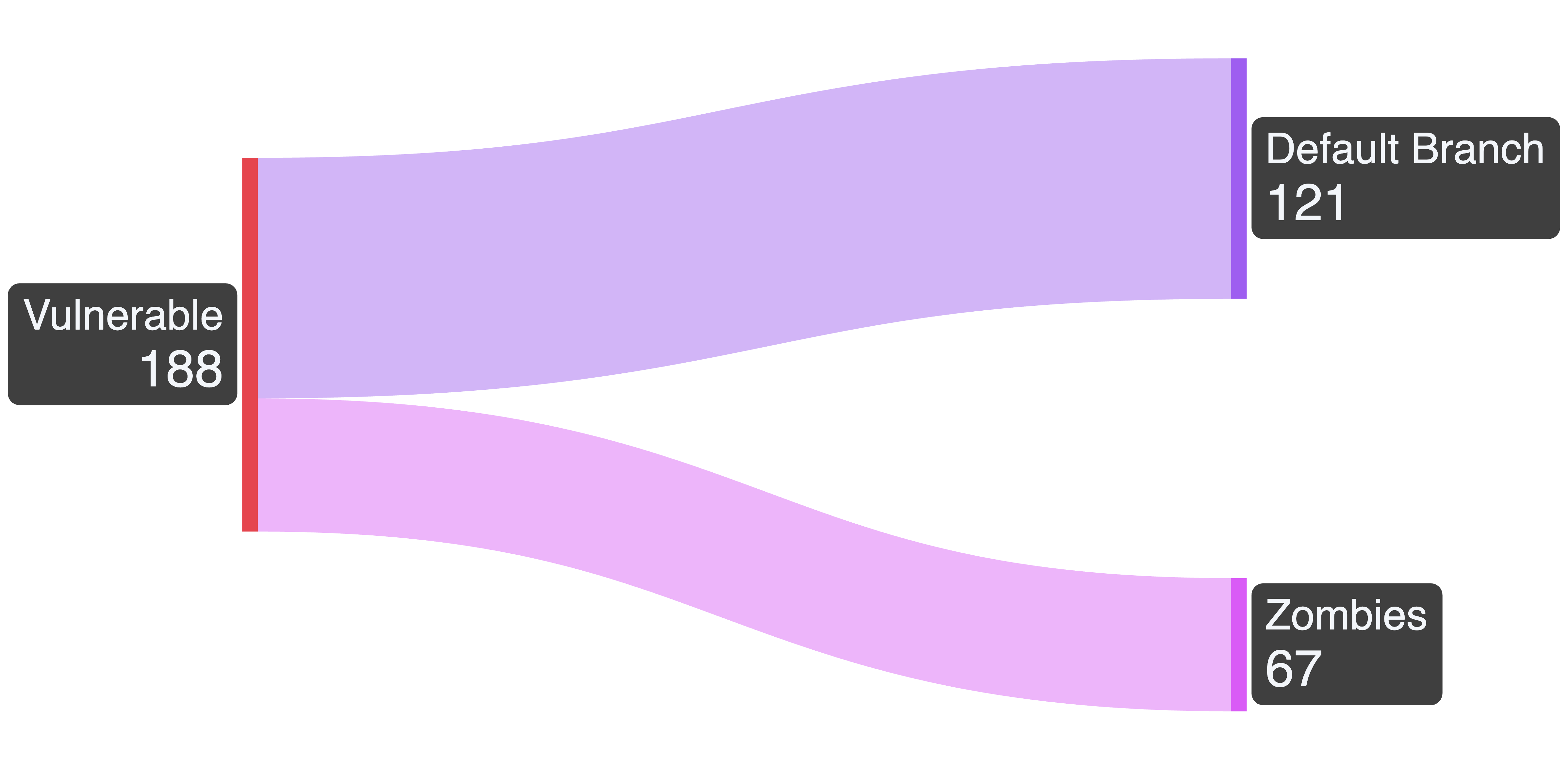 As a final check, we verified if each of the vulnerable repositories is indeed only vulnerable in non-default branches, or if the vulnerability still exists in the default branch. To our surprise, a majority of 121 workflows fell into the latter category, making us end up with only 67 "true" Zombie Workflows:
