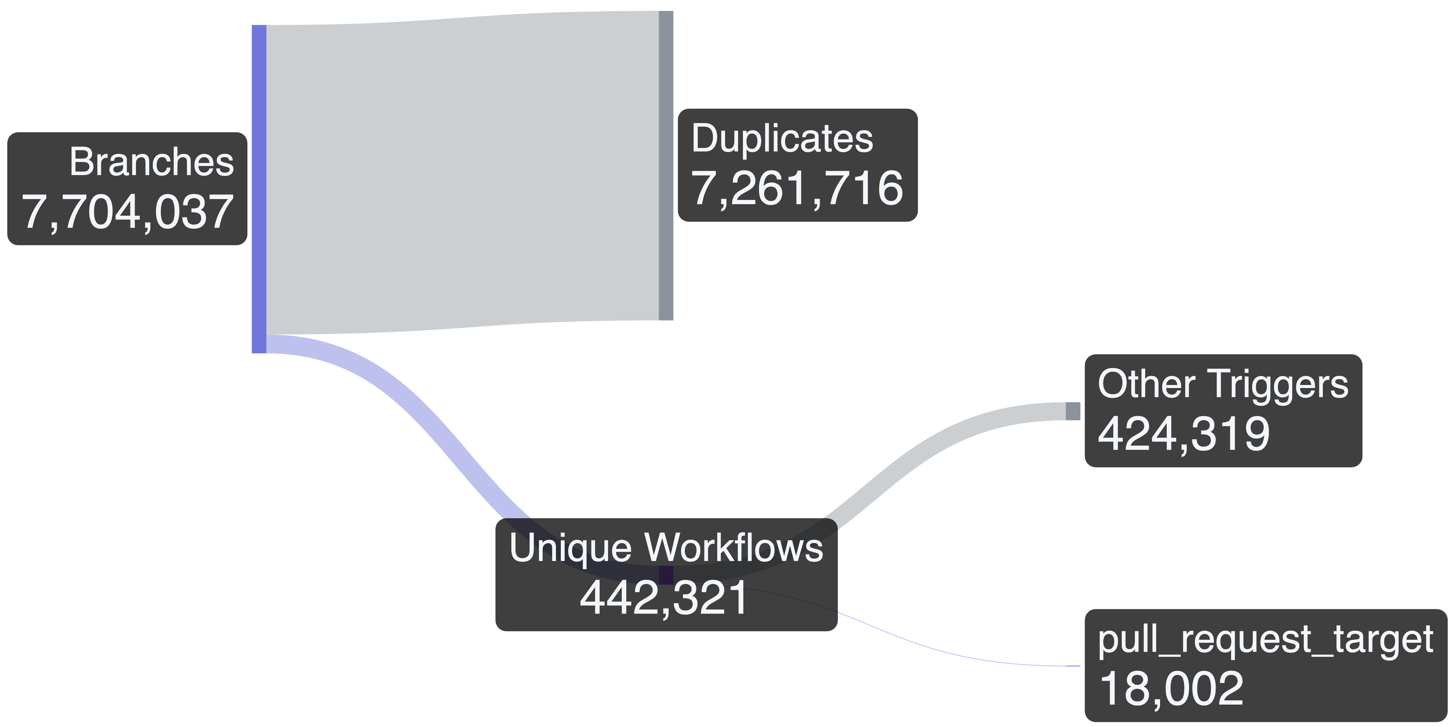 After searching through all 7,704,037 branches of these repos, we found 442,321 unique workflow files. Many of these unique files are different versions of the same workflow, found in different branches that capture the workflow file version at the point in time when the branch was created. Since the only trigger for a Zombie Workflow is pull_request_target, we filtered out all workflows that didn't use this event. This gave us 18,002 workflows that are potentially attackable by a Pwn Request: