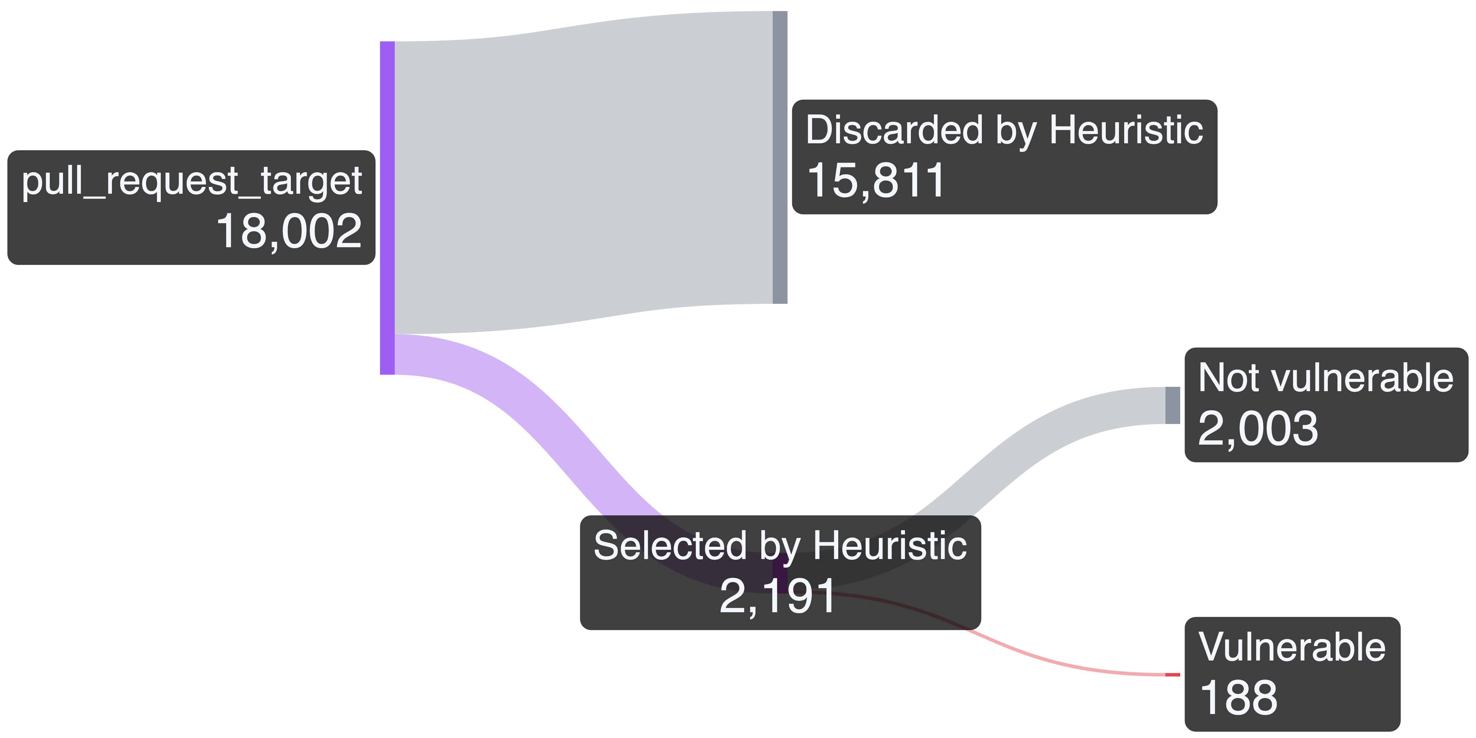 Since this number was still too large to triage manually, we created a heuristic that only kept workflows that check out the head branch and have a potential impact. To determine this, we checked if the workflow used secrets other than GITHUB_TOKEN, or if the permissions were either explicit write permissions, or implicit write permissions derived from the defaults. This resulted in 2,191 candidate workflows out of which we identified 188 to be vulnerable: