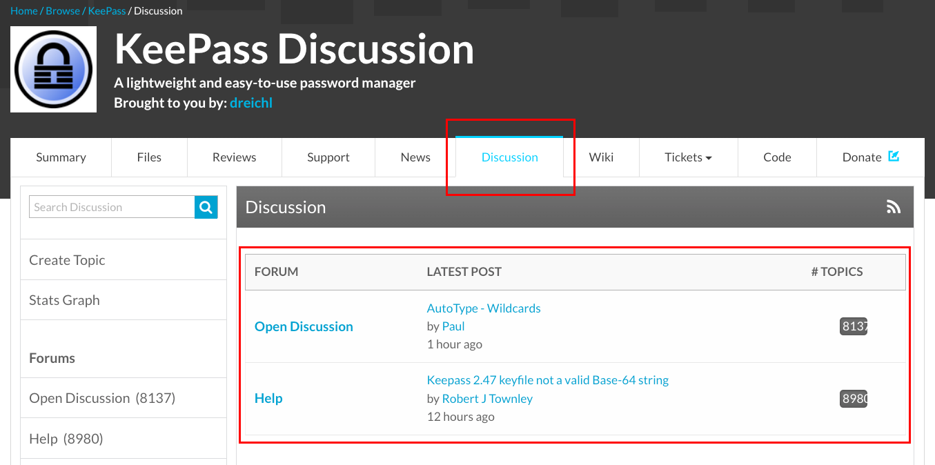 The tool of interest for our consideration is the Discussion tool. Selecting this tool adds a discussion forum to the project, where users can submit posts. For example, this is how the discussion for KeePass looks like on SourceForge: