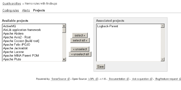 Once a quality profile is defined, projects can be associated to the so-defined profile.
