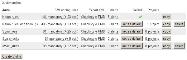 - A set of activated coding rule among +600 available (PMD, Checkstyle and FindBugs) : an activation level (mandatory or optional) and parametrization for each rule