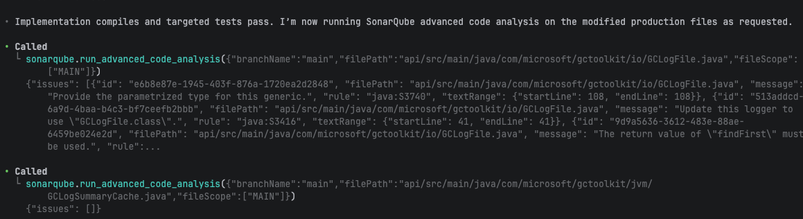 Round 2 fixed the raw generic type (java:S3740) and the ambiguous size() call (java:S2388). But the S3740 fix introduced a new issue: java:S2201, an unused return value from anyMatch. This is the kind of regression a single-pass linter misses. Codex caught it in the next round because Agentic Analysis re-scanned the file after the fix.