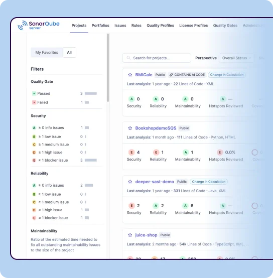 Sonar AI Code Assurance es un proceso sólido y simplificado para validar el código generado por IA mediante un análisis estructurado y exhaustivo. Esto garantiza que cada nuevo fragmento de código cumpla con los más altos estándares de calidad y seguridad antes de pasar a producción.