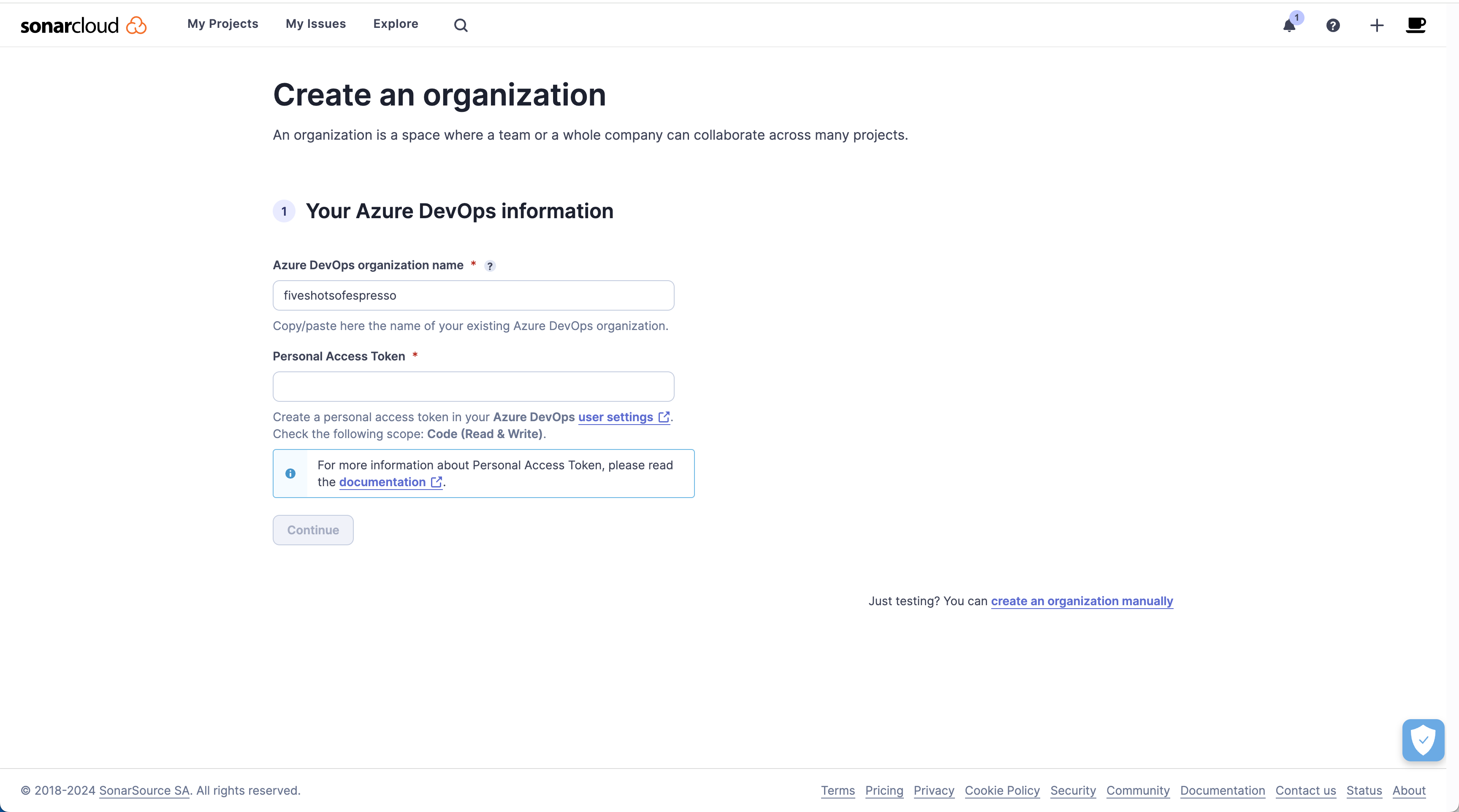 - Once logged into SonarQube Cloud, import an organization from Azure DevOps or create an organization manually.